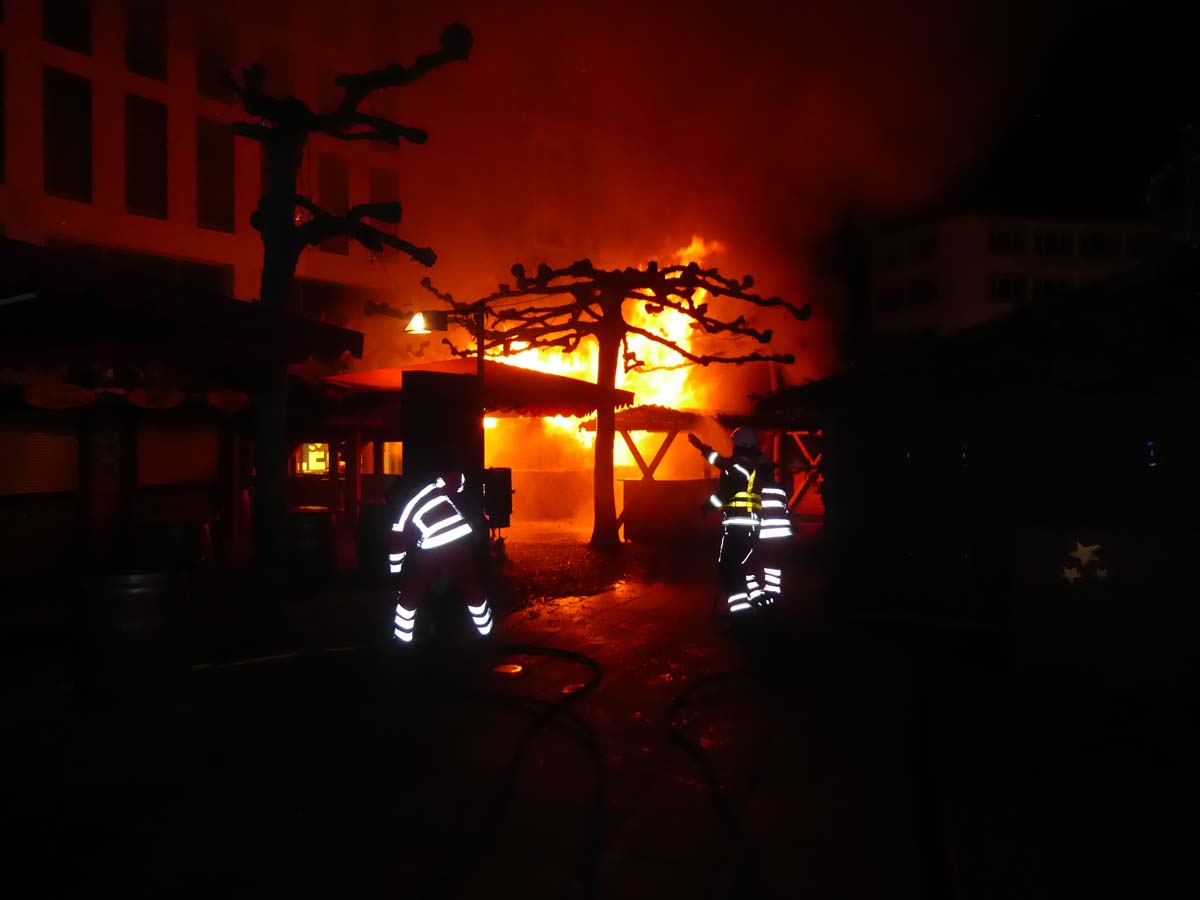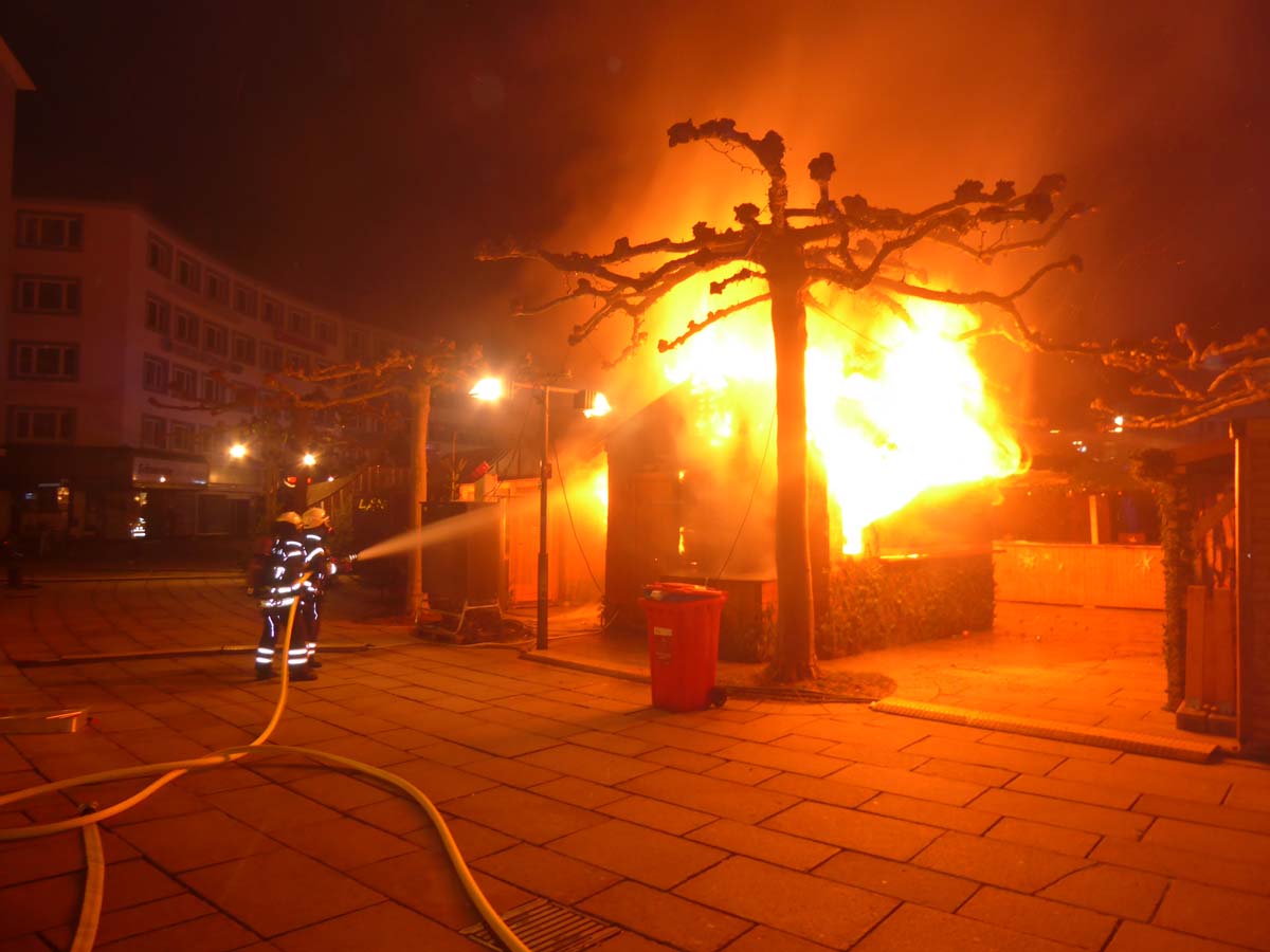 KASSEL. Auf dem Areal des Kasseler Weihnachtsmarktes in der „Unteren Königsstraße“ brannte am frühen Donnerstagmorgen eine Bratwurstbude. Ein Wachmann hatte gegen 4:45 Uhr Flammenschein und Rauch aus der Bude bemerkt. Er alarmierte die Feuerwehr. Durch den schnellen Einsatz der Feuerwehrleute, die mit zwei Trupps unter Atemschutz den Brand bekämpften, konnte ein Übergreifen der Flammen auf weitere Hütten verhindert werden. Nach rund eineinhalb Stunden waren die letzten Glutnester gelöscht, so Feuerwehr-Einsatzleiter Sascha Serafin. Die ersten Ermittlungen der Polizei zur Brandursache haben keinerlei Hinweise auf eine vorsätzliche Brandstiftung ergeben. Verletzt wurde niemand. Den Schaden schätzt die Feuerwehr auf etwa 25.000 EUR. Vor Ort waren rund 20 Feuerwehrleute der Freiwilligen Feuerwehr sowie Berufsfeuerwehrleute der Feuerwache 1.