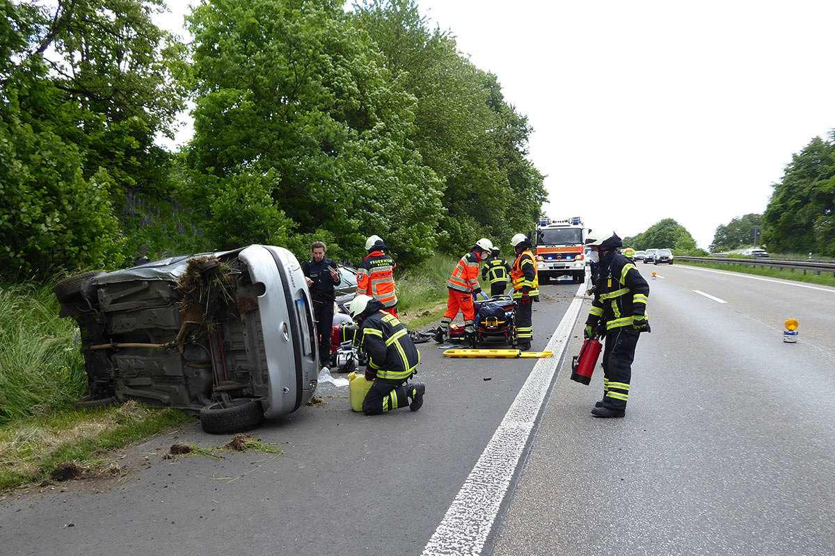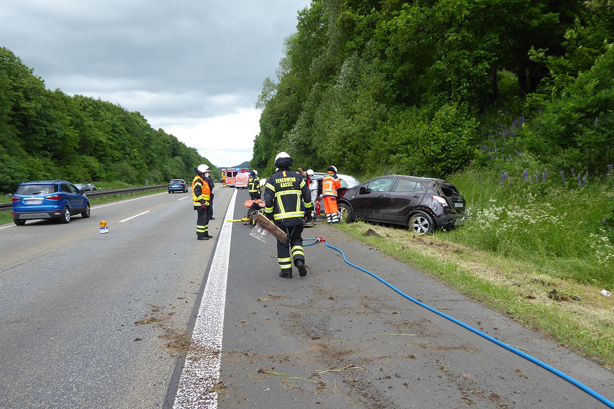 KASSEL. Am Samstag gegen 11:20 Uhr kollidierten auf der Autobahn 44 zwischen den Anschlussstellen Bad Wilhelmshöhe und Zierenberg zwei Pkw. Dabei überschlug sich ein Pkw und kam auf der Seite liegend zum Stillstand. Die vier betroffenen Insassen der beiden Fahrzeuge wurden zunächst von Ersthelfern an der Unfallstelle versorgt, bis der Rettungsdienst und die Feuerwehr an der Einsatzstelle eintrafen. Da alle Personen ohne weitere Hilfsmittel aus den Fahrzeugen befreit werden konnten, war eine technische Rettung durch die Feuerwehr nicht erforderlich. Im weiteren Verlauf wurden die Verletzten durch den Rettungsdienst und die Feuerwehr an der Einsatzstelle medizinisch behandelt, auslaufende Betriebsstoffe gebunden und der Brandschutz sichergestellt. Der Rettungsdienst brachte die Verletzten im Anschluss in umliegende Krankenhäuser. Die Einsatzleitung der Berufsfeuerwehr hatte René Pletscher. Vor Ort waren der Rüstzug der Feuerwache 2, drei Rettungs- und ein Notarztteam sowie eine Streifenwagenbesatzung der Polizeiautobahnstation Baunatal.