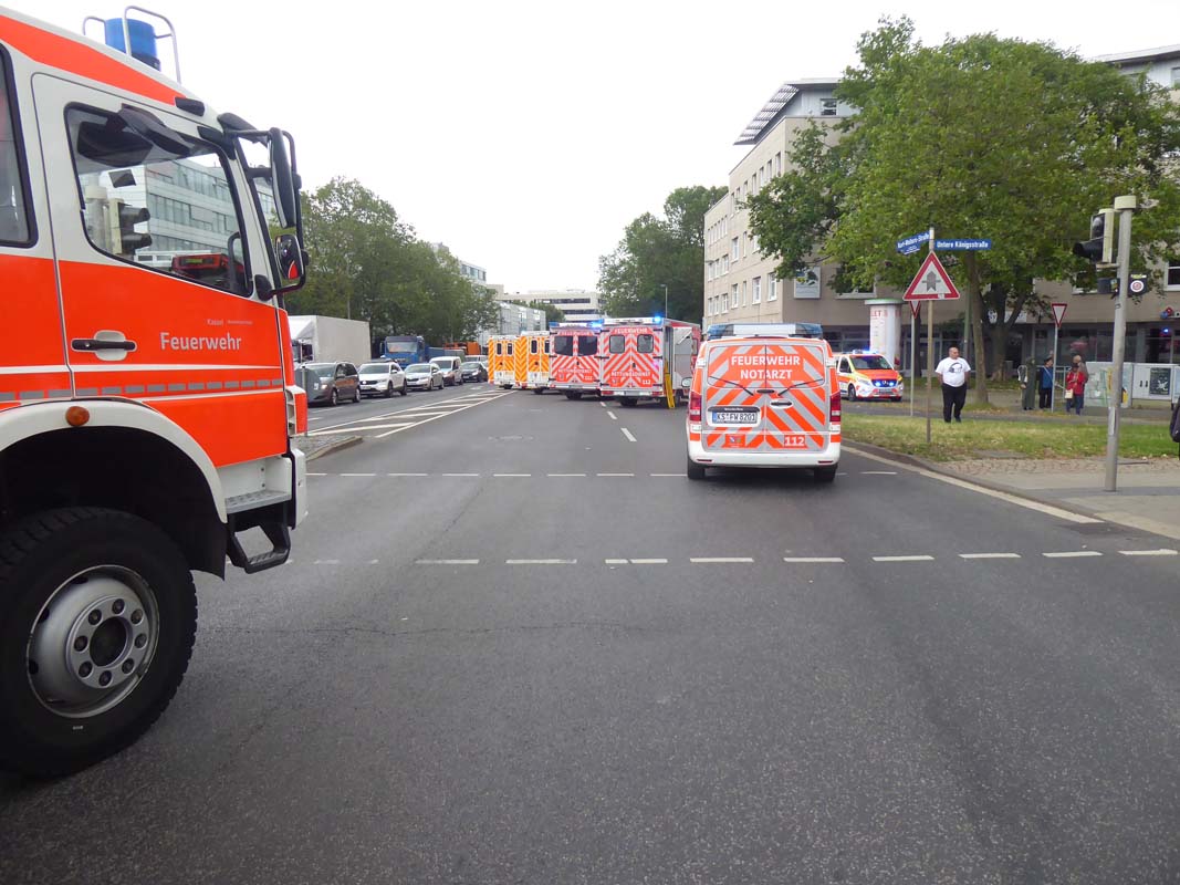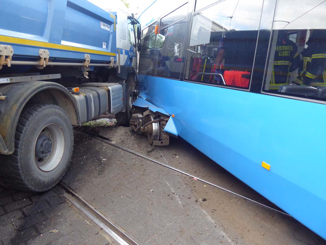 Auf dem Holländischen Platz in der Kasseler Nordstadt kollidierten am Montag gegen 10:40 Uhr ein Lkw und eine Straßenbahn. Bei dem Unfall sind nach jetzigem Stand neun Personen verletzt worden, von denen die Rettungskräfte sechs in Krankenhäuser gebracht haben, unter den Verletzten sind der Fahrer der Straßenbahn und mehrere Fahrgäste. Die Verletzungen sollen mitunter schwerwiegend sein, wobei nach aktuellem Stand niemand in Lebensgefahr schweben soll.