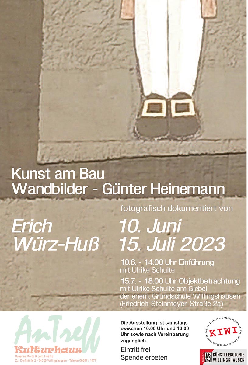 WILLINGSHAUSEN. Das Kulturhaus AnTreff in Willingshausen zeigt in Zusammenarbeit mit der Kultur-Initiative-Willingshausen e.V. (KIWI) vom 10.6. bis zum 15.7. Fotografien von Wandbildern des Willingshäuser Künstlers Günter Heinemann. Die Wandbilder sind als „Kunst am Bau“ bei öffentlichen Bauvorhaben entstanden und können als solche nicht im Original in einer Ausstellung zusammengeführt werden.