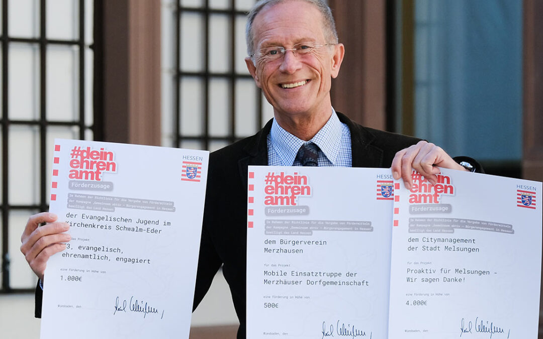 Das Ehrenamt ist für die Hessische Landesregierung von zentraler Bedeutung und seit vielen Jahren im Fokus. „Wer ehrenamtlich hilft, hält unsere Gesellschaft am Laufen.  Die Coronapandemie hat uns noch einmal verdeutlicht, dass das Ehrenamt gerade in außergewöhnlich schwierigen Zeiten ein tragendes Fundamt ist, auf dem unsere Gesellschaft ruht. Wir würdigen diesen Einsatz mit Dank und Anerkennung, aber auch in hohem Maße finanziell – in diesem Jahr mit mehr als 32 Millionen Euro. Jeder Euro davon ist gut investiert“, betonte Axel Wintermeyer, Chef der Staatskanzlei. (wal)
