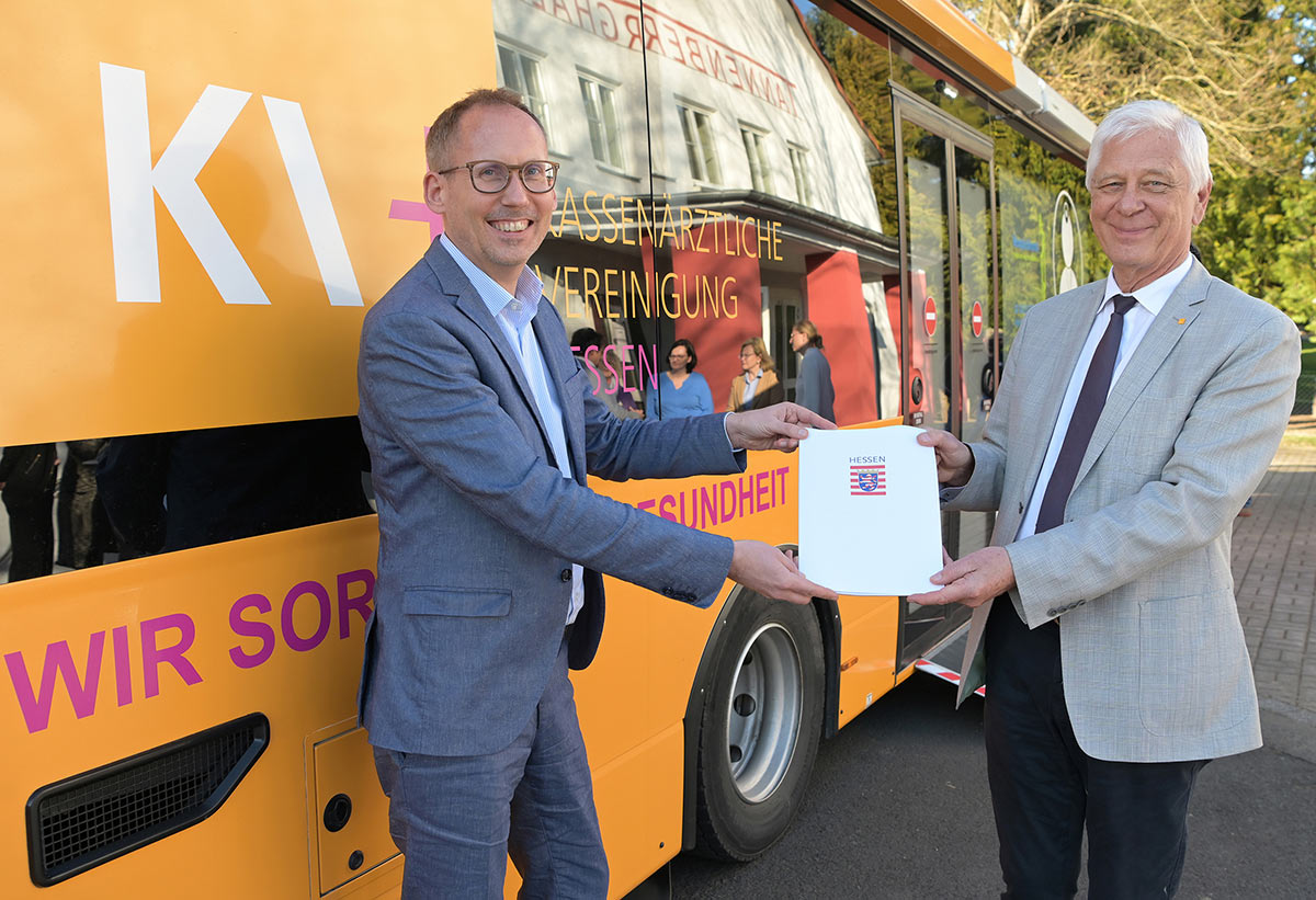 Im Rahmen des neuen Projekts Medibus 2.0 wurde das mit Landesmitteln in Höhe von ca. 1,4 Millionen Euro geförderte Leistungsspektrum der rollenden Praxis noch einmal erweitert. Hierfür hat Sozialminister Kai Klose am Mittwoch vor Ort einen Förderbescheid an Dr. Eckhard Starke, den stellvertretenden Vorstandsvorsitzenden der KV Hessen, übergeben.