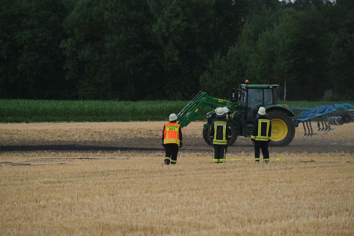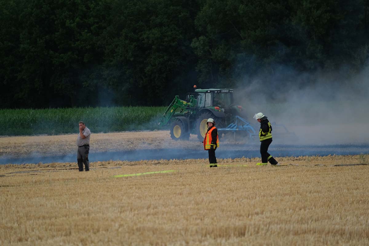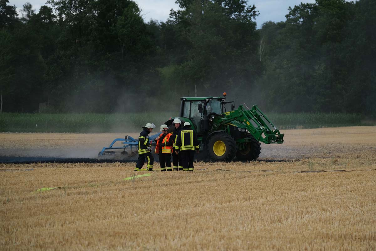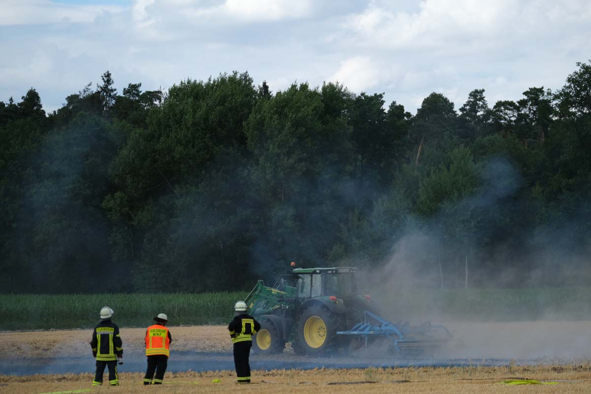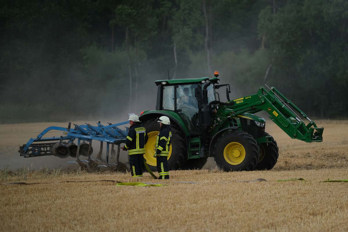 Landwirte unterstützen die Löschmaßnahmen der in beiden Fällen rund 25 Feuerwehrleute, indem sie mit Eggen den Acker bearbeiteten und damit den Flammen die Stoppeln nahmen.