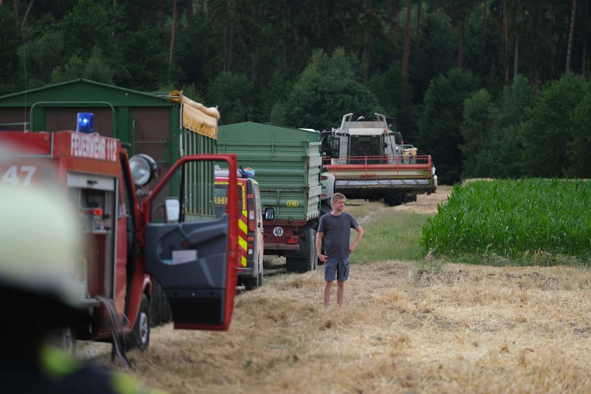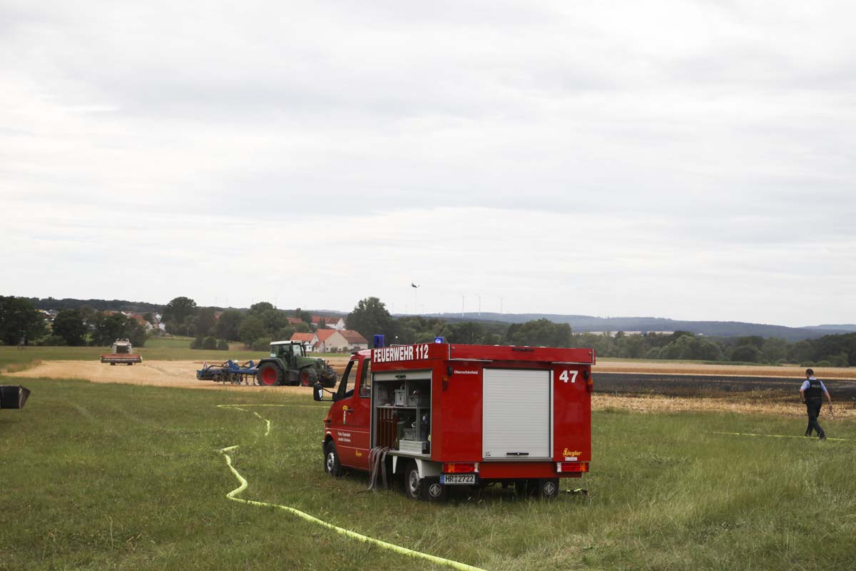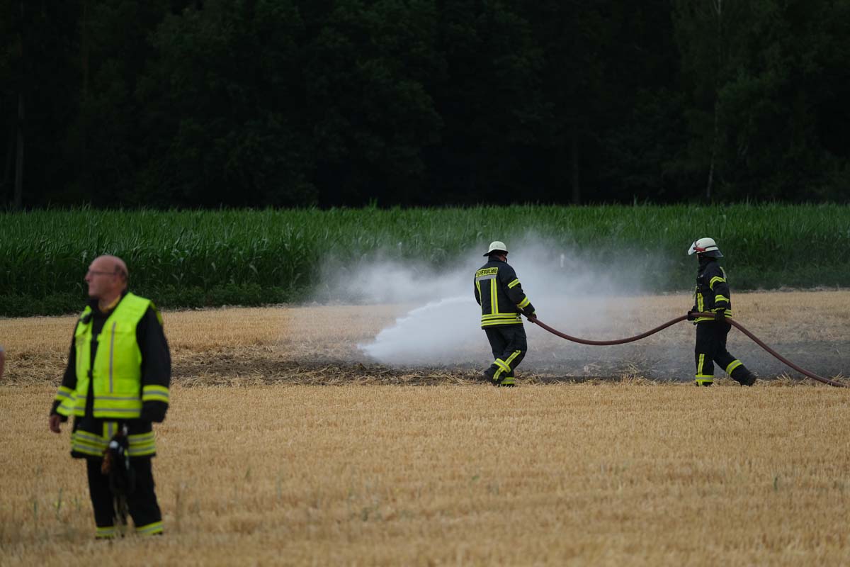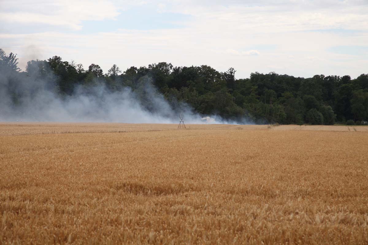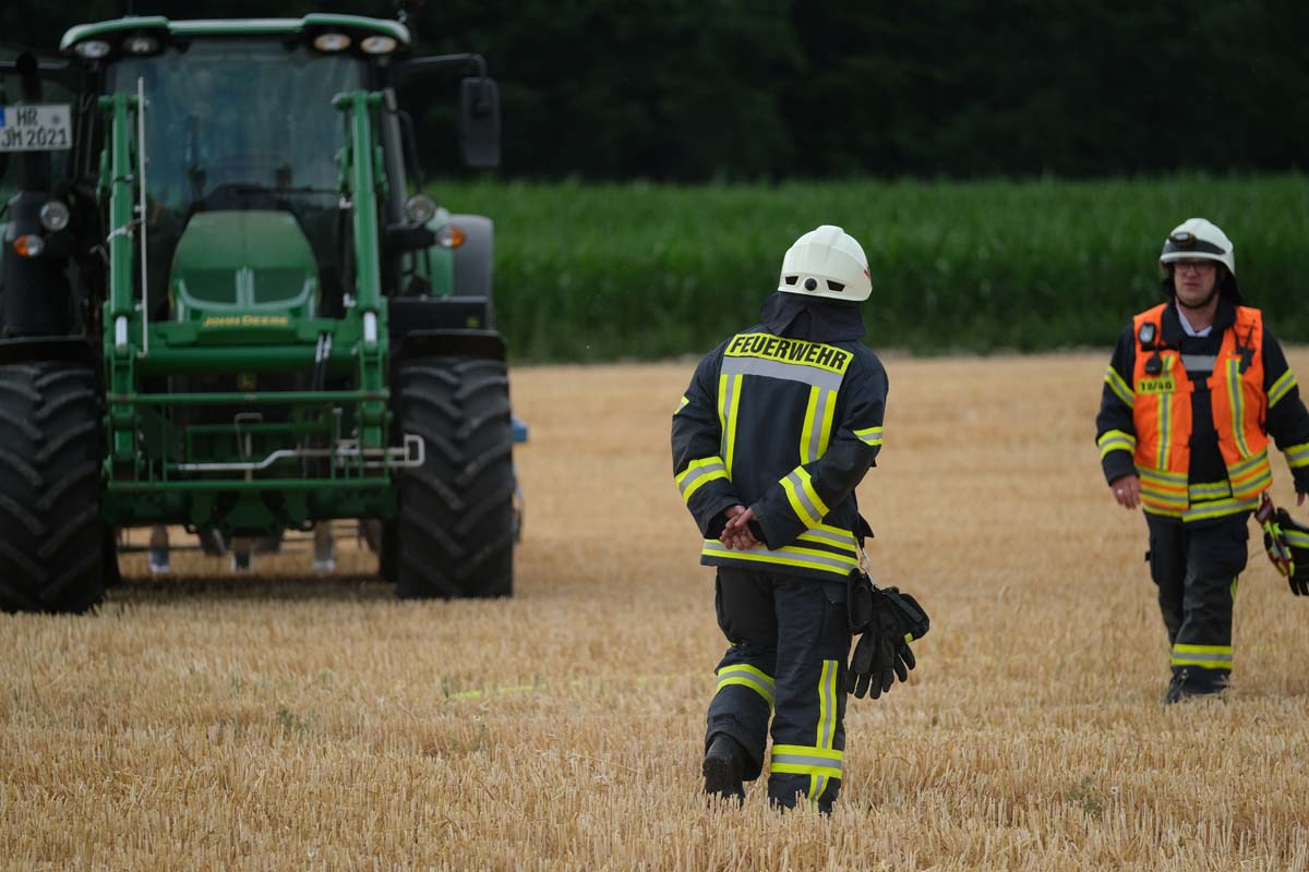 Landwirte unterstützen die Löschmaßnahmen der in beiden Fällen rund 25 Feuerwehrleute, indem sie mit Eggen den Acker bearbeiteten und damit den Flammen die Stoppeln nahmen.