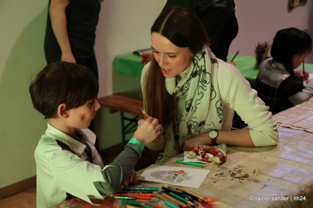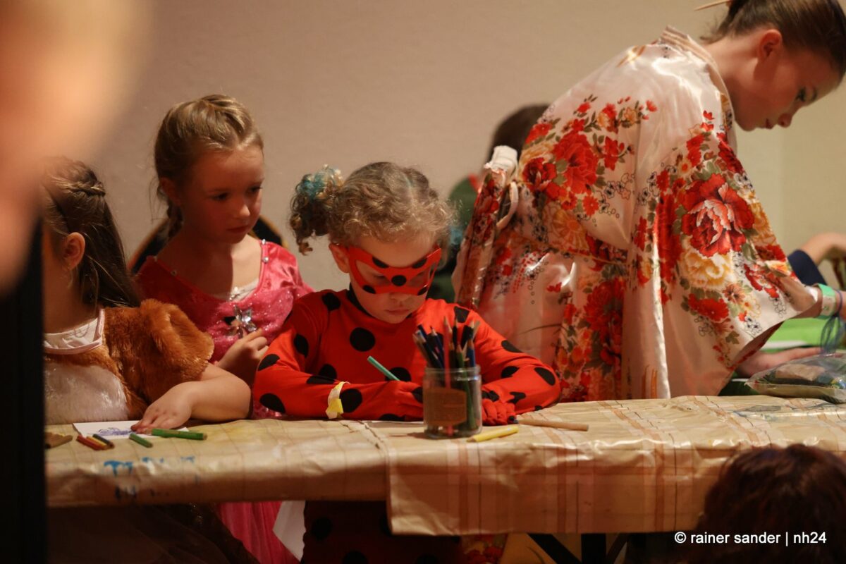 Auch beim Malen vertrugen sich Prinzessinnen, Supermänner, freche Maja-Bienen, Weltraumhelden, Polizisten, Jediritter, Meerjungfrauen, Wilde Tiger, zahme Kätzchen sowie eine bunte Tier- und Comicwelt bestens. Zwischendurch suchten Spidermen, Rudi Raabe, Bob der Baumeister oder Super Mario um die Wette mit Harry Potter nach Katzenbildern. Es war zweitrangig, dass die Blauen vor den Gelben siegten. Der Spaß und die Erlaubnis, auch mal unter die Tische zu krabbeln, zählte.