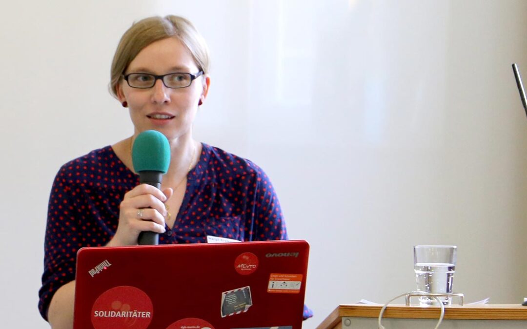 Margit Kreikenbom von der Kindersprachbrücke Jena, griff in ihrem anschließenden Vortrag „Funktionaler Analphabetismus als Gegenstand Sozialer Arbeit“ genau den Umgang mit der Schnittstelle zwischen Betroffenen und Sozialer Arbeit auf. Sie erklärte: „Soziale Arbeit ist die Schnittstelle zwischen Bildung und Wohlfahrt.“ Zu oft jedoch sei für Sozialarbeitende die Problemlage nicht sofort erkennbar, auch, weil Betroffene über Jahre hinweg Vermeidungs- und Täuschungsstrategien entwickelten. Zum einen aus Scham, zum anderen aus der Notwendigkeit heraus, den Alltag zu bewältigen.