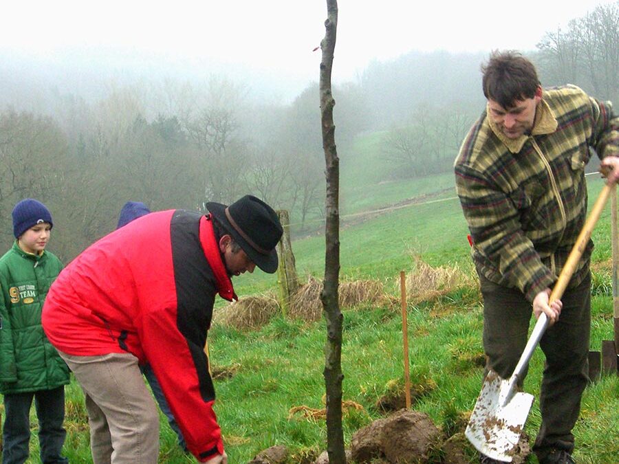 Der Ortslandwirt Hans-Jürgen Schäfer (links im Bild) legte als einer der Paten der „Neuen Bantzer-Buche“ bei der Pflanzung am 5. April 2008 zusammen mit dem damaligen Stellvertretenden Vorsitzenden des Fördervereins Kulturlandschaft, Frank Schnücker, selbst Hand an. (Jörg Haafke/nh)