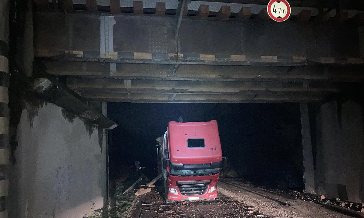 Das Fahrerhaus des Lastwagens kippte durch den Anstoß nach vorne. In der Folge rutschten die geladenen Baumstämme gegen die Kabinenrückwand. Der Sachschäden an dem Lastwagen und der Eisenbahnbrücke sind bislang noch nicht abzusehen. (wal)