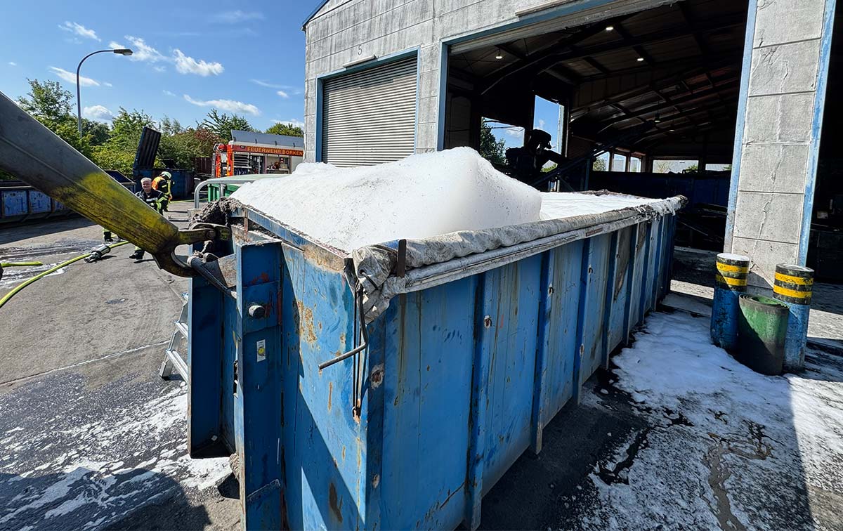 Unter der Leitung von Einsatzleiter Mario Diehl löschte die Feuerwehr den brennenden Inhalt des Containers im Freien mit Netzmittel. Die Flammen konnten so rasch erstickt werden. Ob es Schäden an der Halle gab, ist derzeit noch unklar.