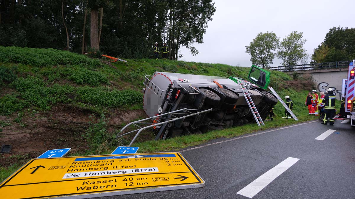 HOMBERG (EFZE). Am Caßdorfer Kreuz in Homberg (Schwalm-Eder-Kreis), auf der Bundesstraße 323, haben am Montagmorgen Feuerwehrleute nach einem Unfall einen Lkw-Fahrer (60) aus seinem Fahrerhaus gerettet. Der Mann wurde bereits im Lkw medizinisch betreut, anschließend schonend aus dem Fahrzeug befreit und nach der Erstversorgung im Rettungswagen in ein Krankenhaus gebracht.