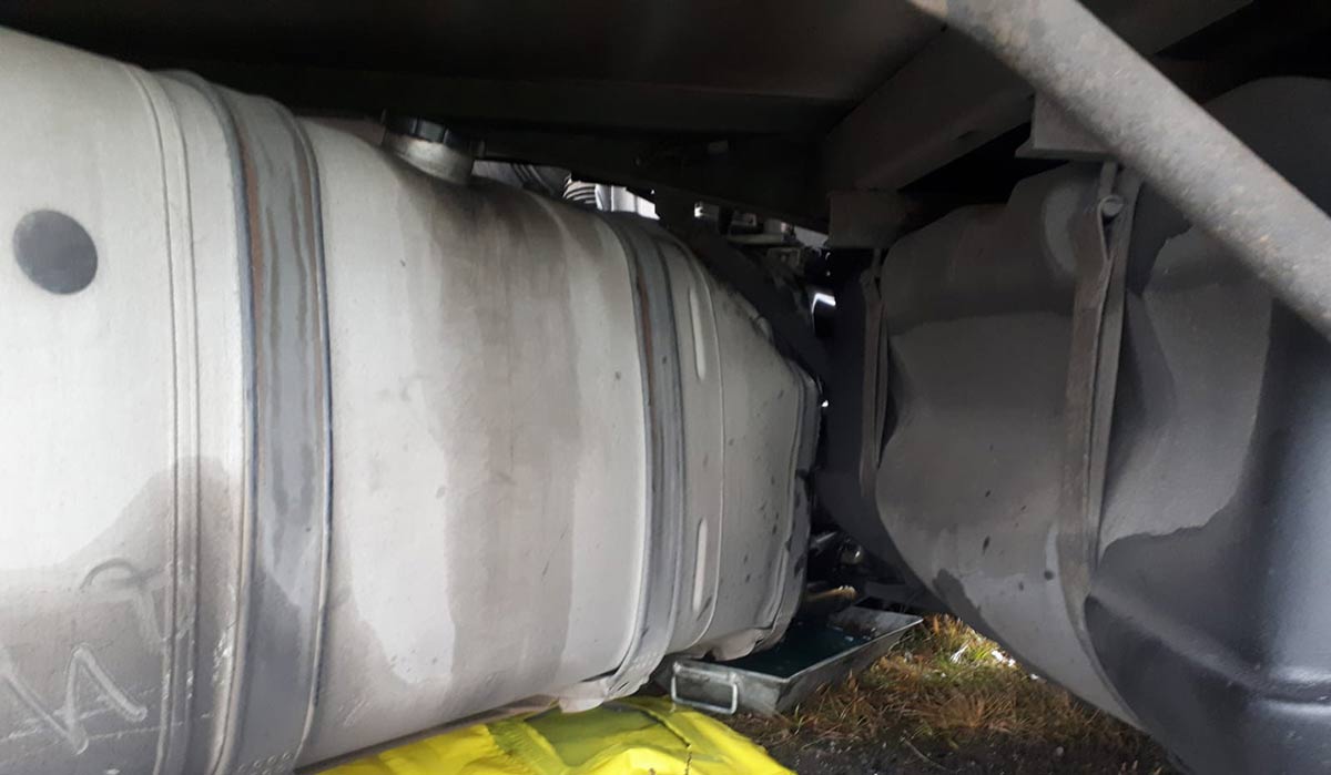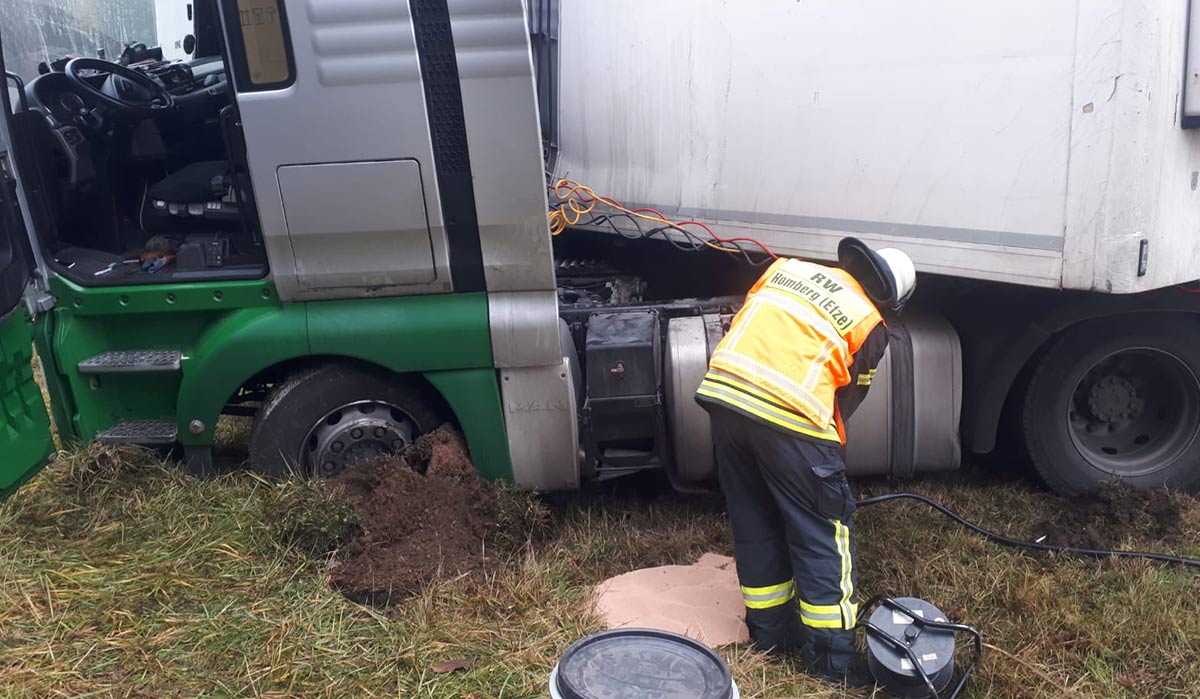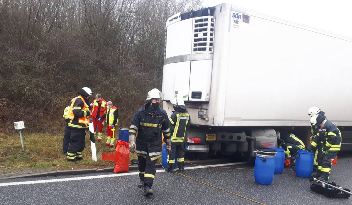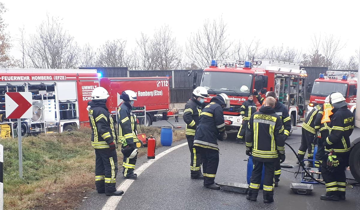 Bei dem Unfall riss einer der Tanks der Zugmaschine auf. Alarmierte Feuerwehrleute aus Homberg und Holzhausen pumpten den verbliebenen Kraftstoff ab. Etwa 300 Liter Diesel liefen aus. Zudem musste aus der Kühlanlage des Trailers die Flüssigkeit entfernt werden.