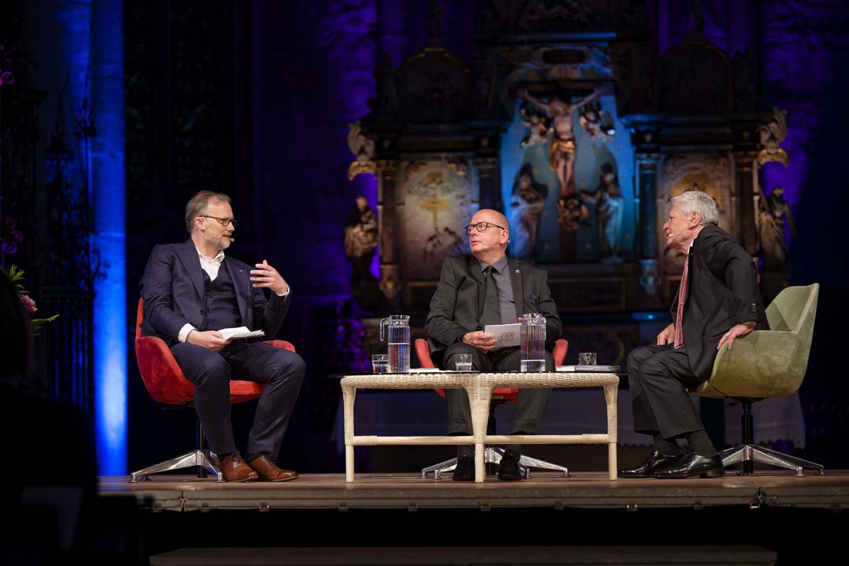 Im Anschluss an seine Lesung diskutierte Gauck mit Landrat Jens Womelsdorf und Ralf Laumer, dem Leiter des Landratsbüros, über die Entstehung seines Buches und die Bedeutung der Demokratie. Gauck riet dem Landrat, stets verständlich und nahbar mit den Menschen zu sprechen.