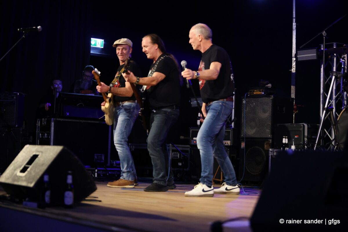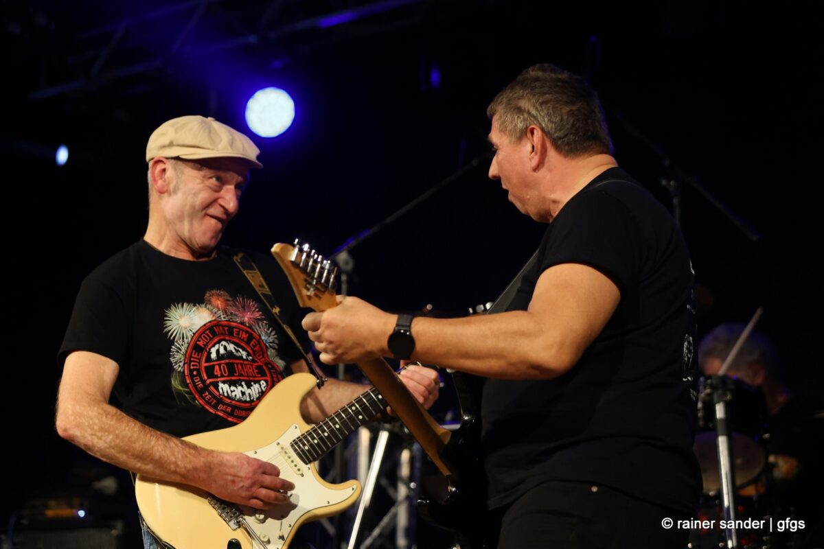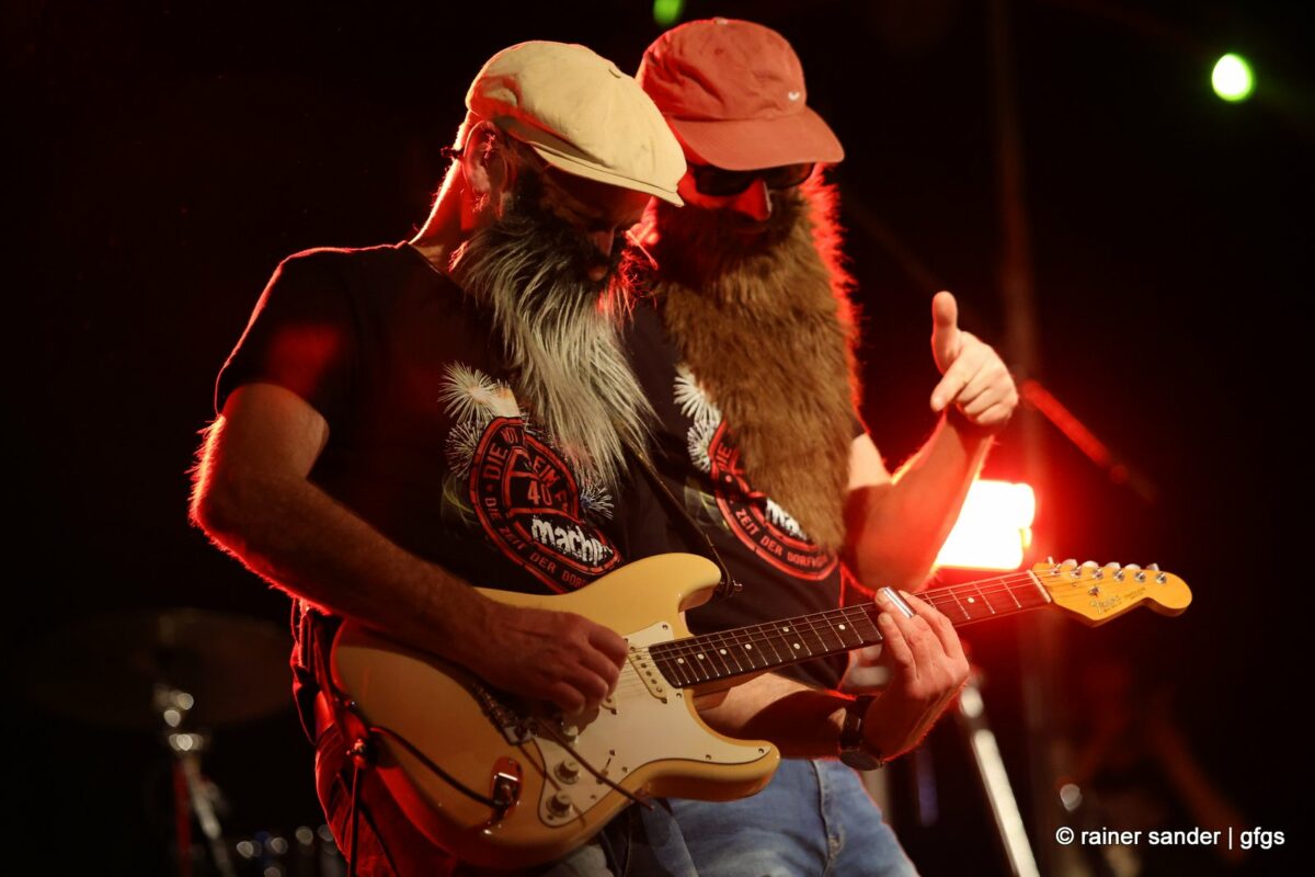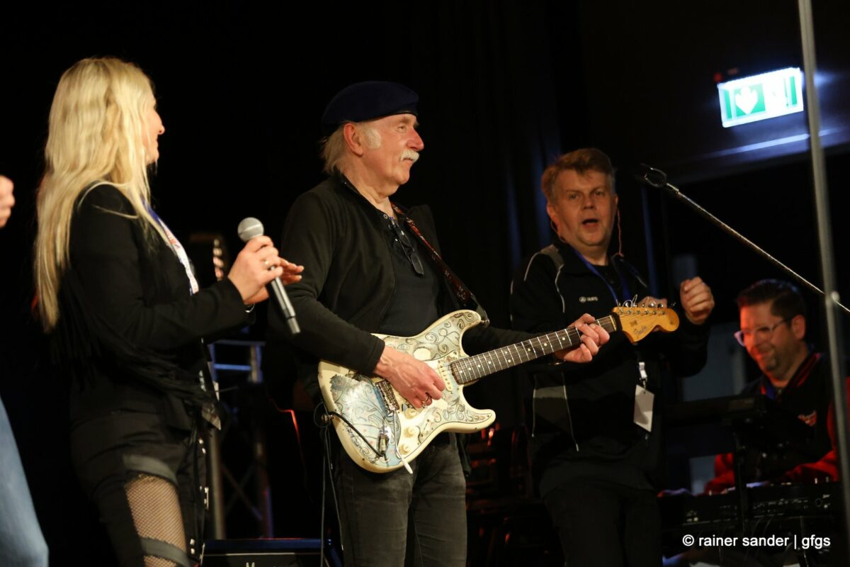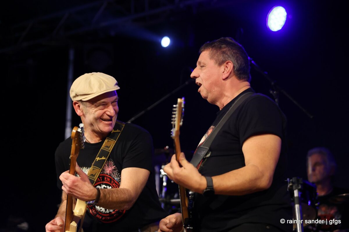 Auf der warteten schon Rockmachine und Harry Stingl, der für den verunglückten Fichte an der Gitarre einsprang. Keine Sorge, Fichte geht’s besser und bald wieder gut! „Come Together“ forderten die Rocker mit „Superstition“. „Davy‘s immer noch on The Road Again! „Westerland“ grüßt den, „Flieger und die Sonne“!. Lange Bärte wuchsen zum ZZ-Top-Medley und gelbe Haare (ja, nee) für „In The Midnight Hour“ um Viertel vor zwölf …