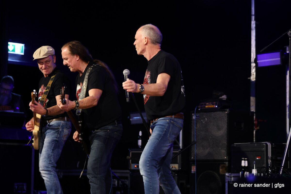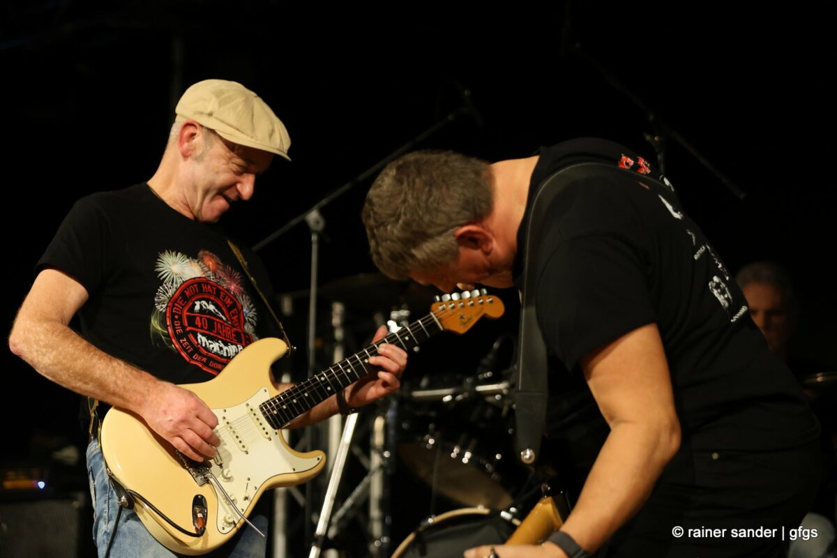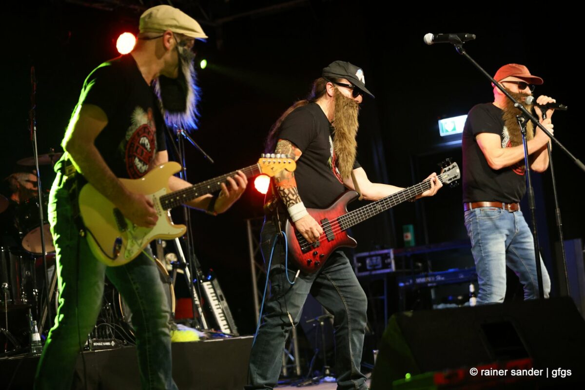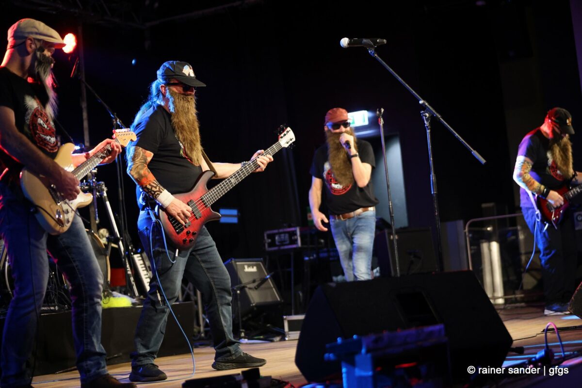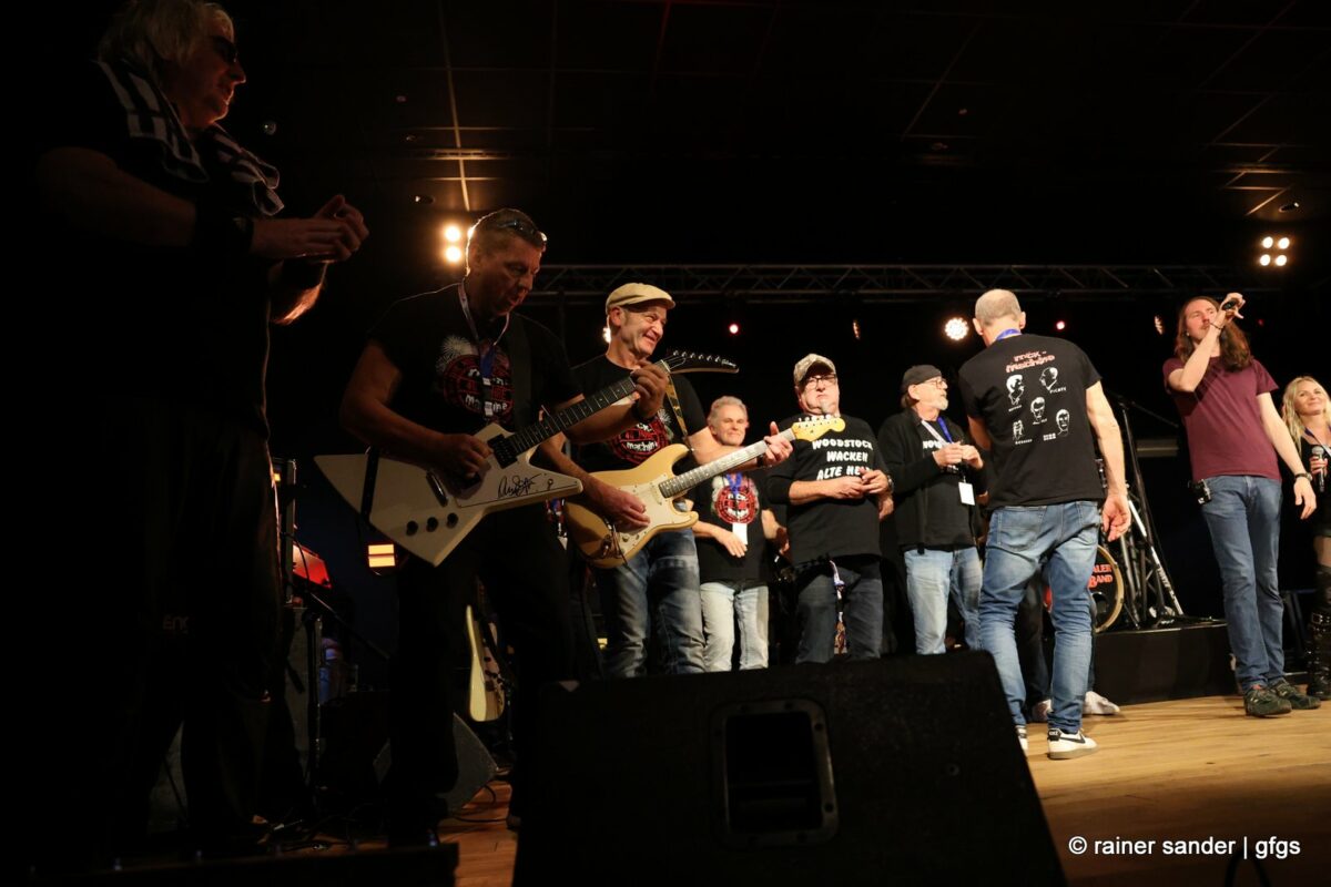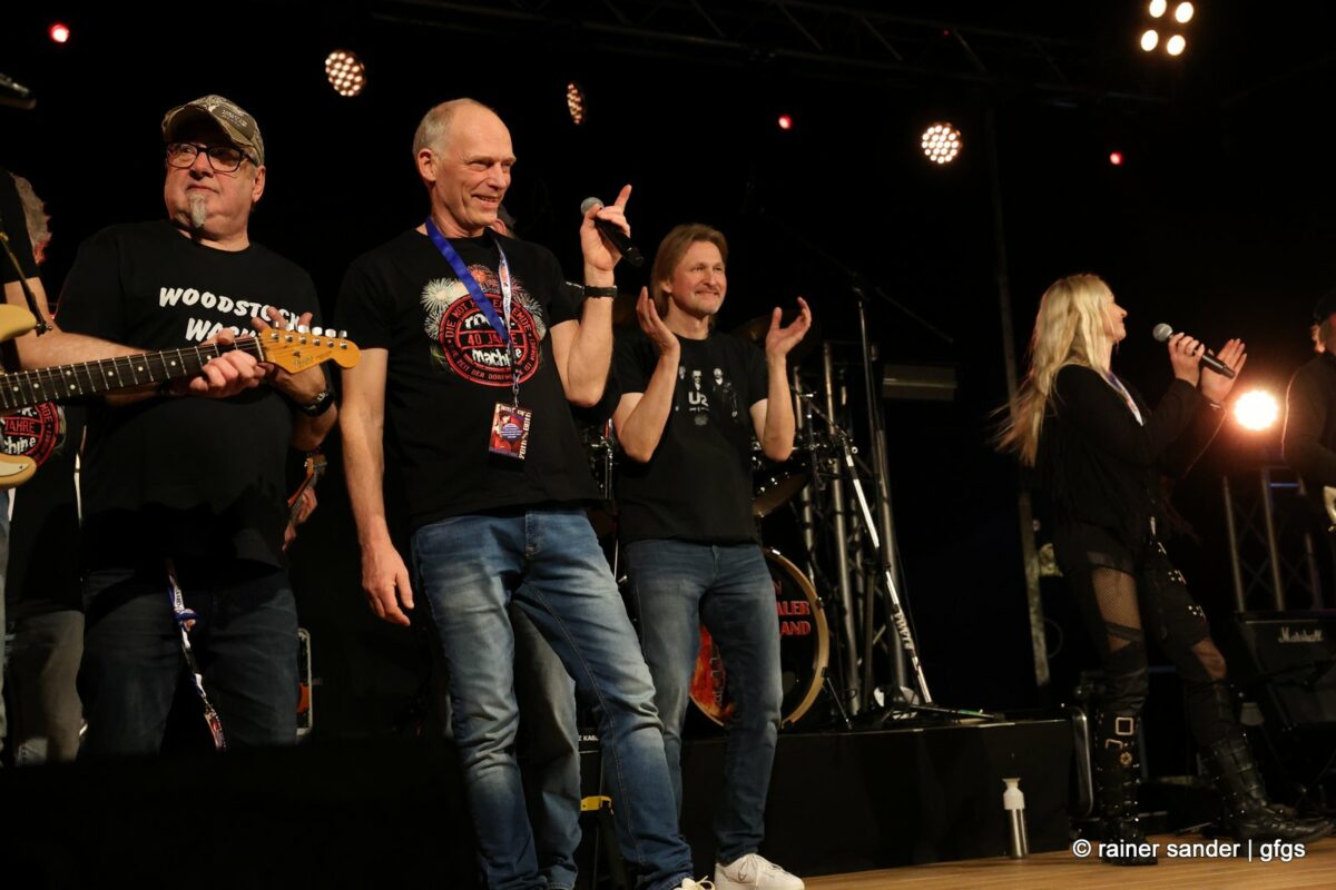 Auf der warteten schon Rockmachine und Harry Stingl, der für den verunglückten Fichte an der Gitarre einsprang. Keine Sorge, Fichte geht’s besser und bald wieder gut! „Come Together“ forderten die Rocker mit „Superstition“. „Davy‘s immer noch on The Road Again! „Westerland“ grüßt den, „Flieger und die Sonne“!. Lange Bärte wuchsen zum ZZ-Top-Medley und gelbe Haare (ja, nee) für „In The Midnight Hour“ um Viertel vor zwölf …