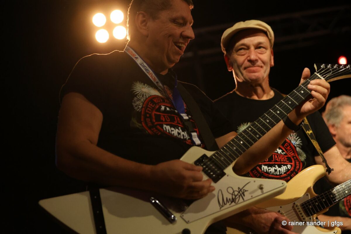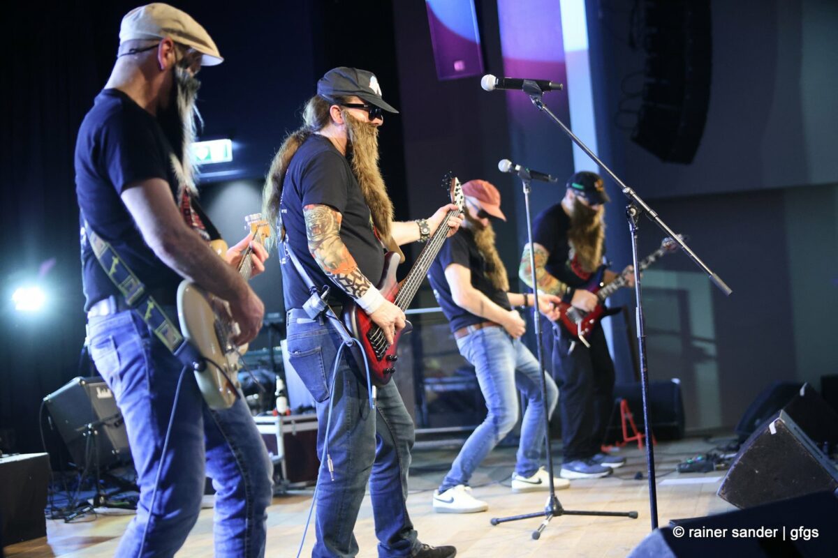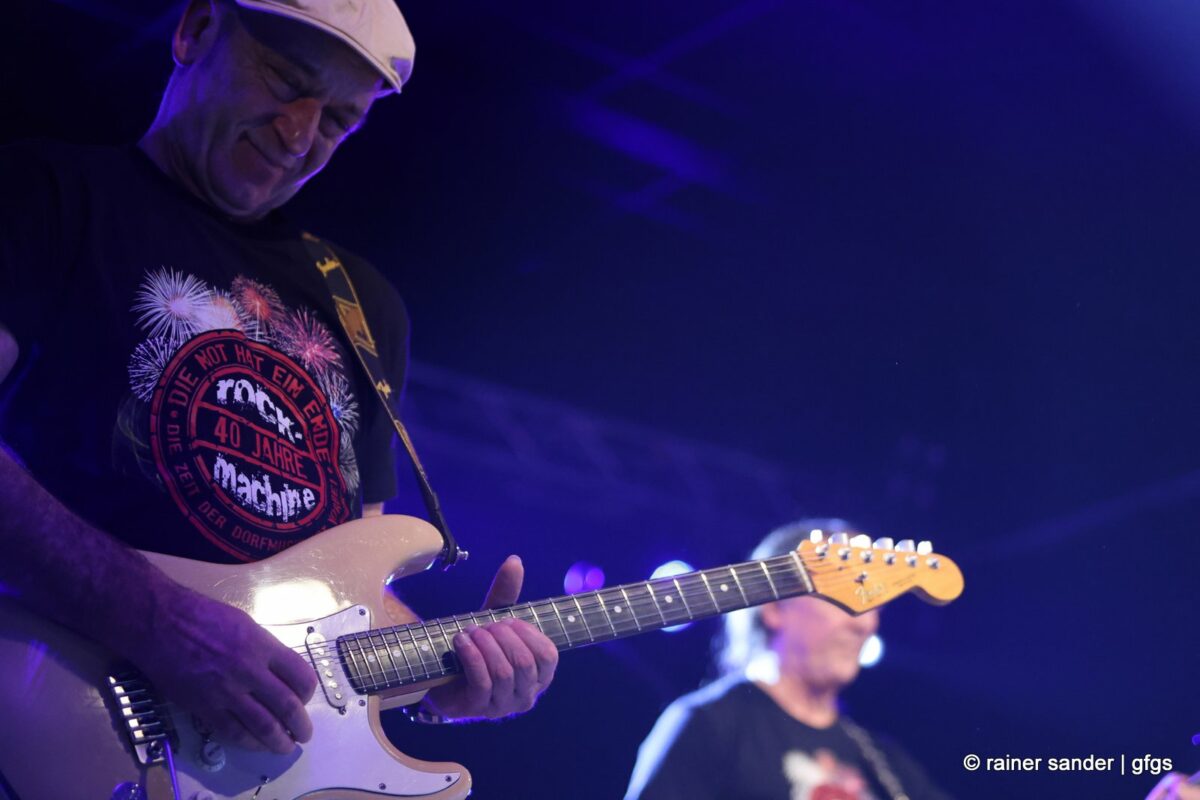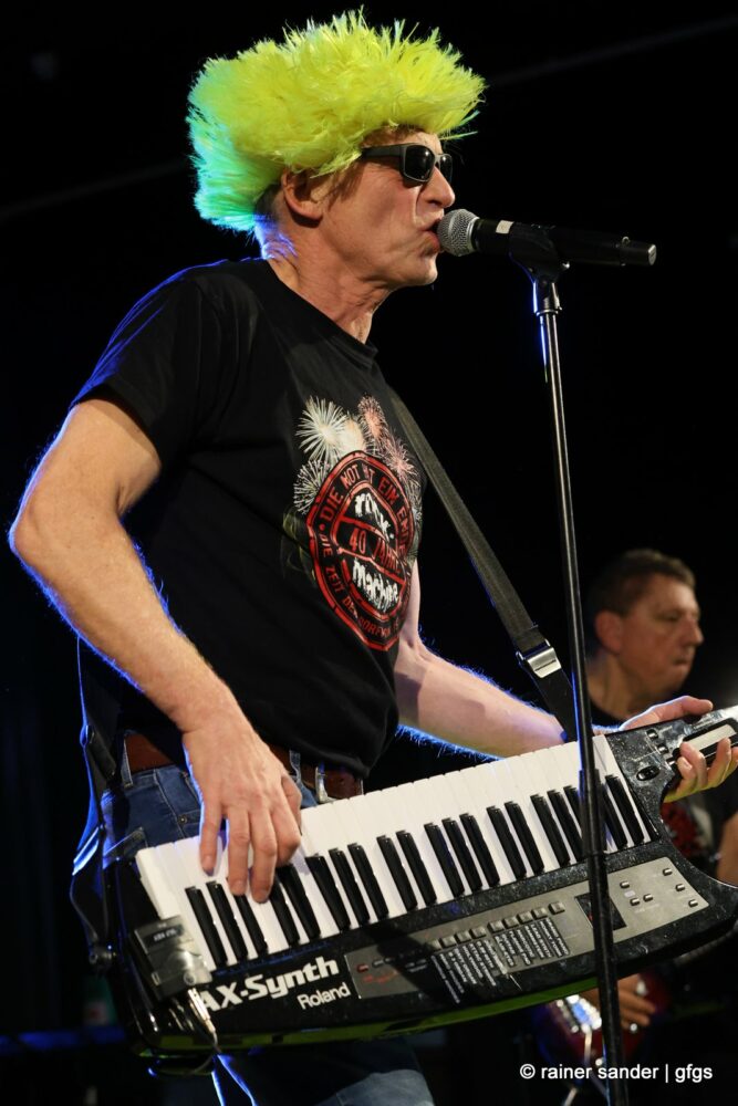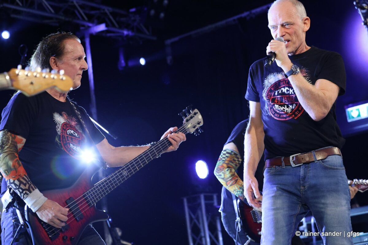 Auf der warteten schon Rockmachine und Harry Stingl, der für den verunglückten Fichte an der Gitarre einsprang. Keine Sorge, Fichte geht’s besser und bald wieder gut! „Come Together“ forderten die Rocker mit „Superstition“. „Davy‘s immer noch on The Road Again! „Westerland“ grüßt den, „Flieger und die Sonne“!. Lange Bärte wuchsen zum ZZ-Top-Medley und gelbe Haare (ja, nee) für „In The Midnight Hour“ um Viertel vor zwölf …