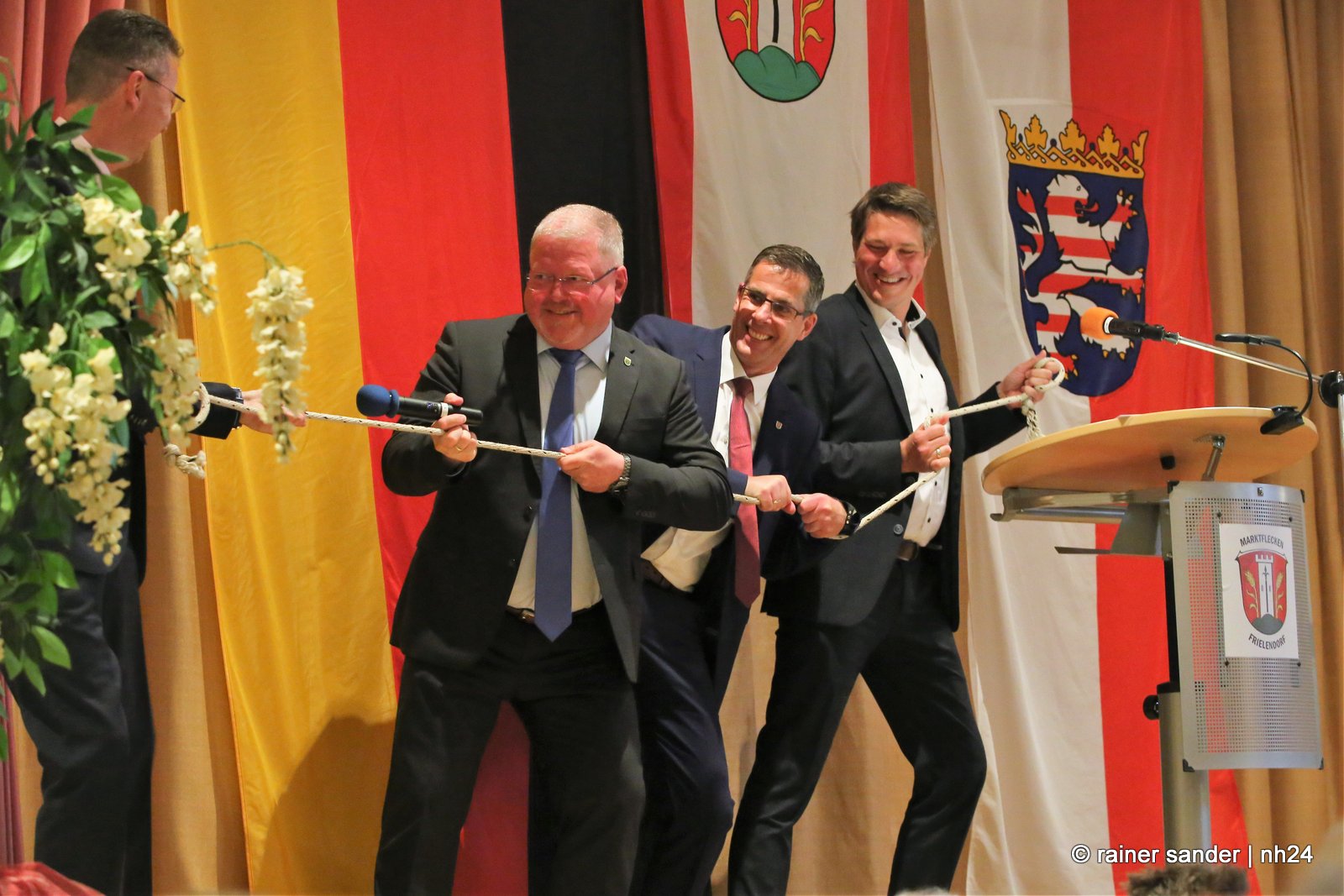 Abschieds- und Eintrittswünsche kamen auch von Volker „Bär“ Siemon für den Personalrat, Christian Nill für die Freiwillige Feuerwehr und den Amtskollegen Jürgen Liebermann (Schwarzenborn) und Dr. Nico Ritz (Homberg), mit denen Frielendorf interkommunal eng zusammenarbeitet. Sie schenkten Jens Nöll ein Tau, um zu üben, wie man gemeinsam an einem Strang zieht, und zwar in die gleiche Richtung.