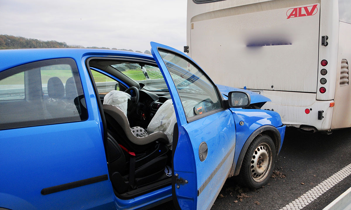 Während alle sieben Insassen des Busses unverletzt blieben, wurden der Pkw-Fahrer und ein mit im Auto sitzendes dreijähriges Kind leicht verletzt.