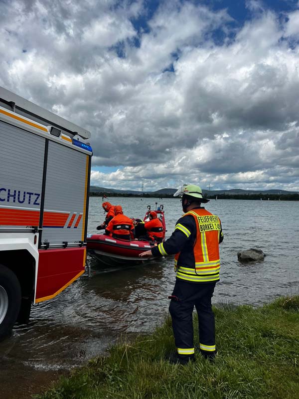 Selina Diehl von der Feuerwehr Borken berichtete, dass die Taucher den Notruf abgesetzt hatten und nach ihrem Kollegen suchten. Feuerwehrleute, teilweise in Offshore-Schutzanzügen, ließen dann ein Boot zu Wasser, während die Taucher nach ihrem Kollegen suchten.