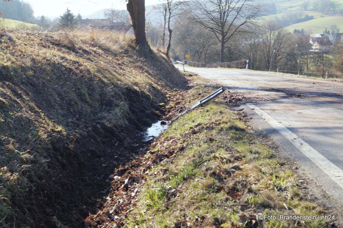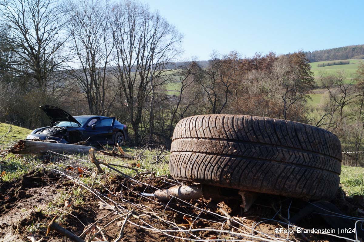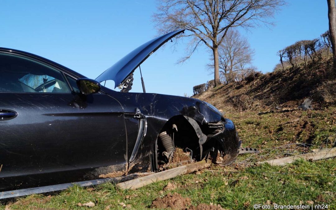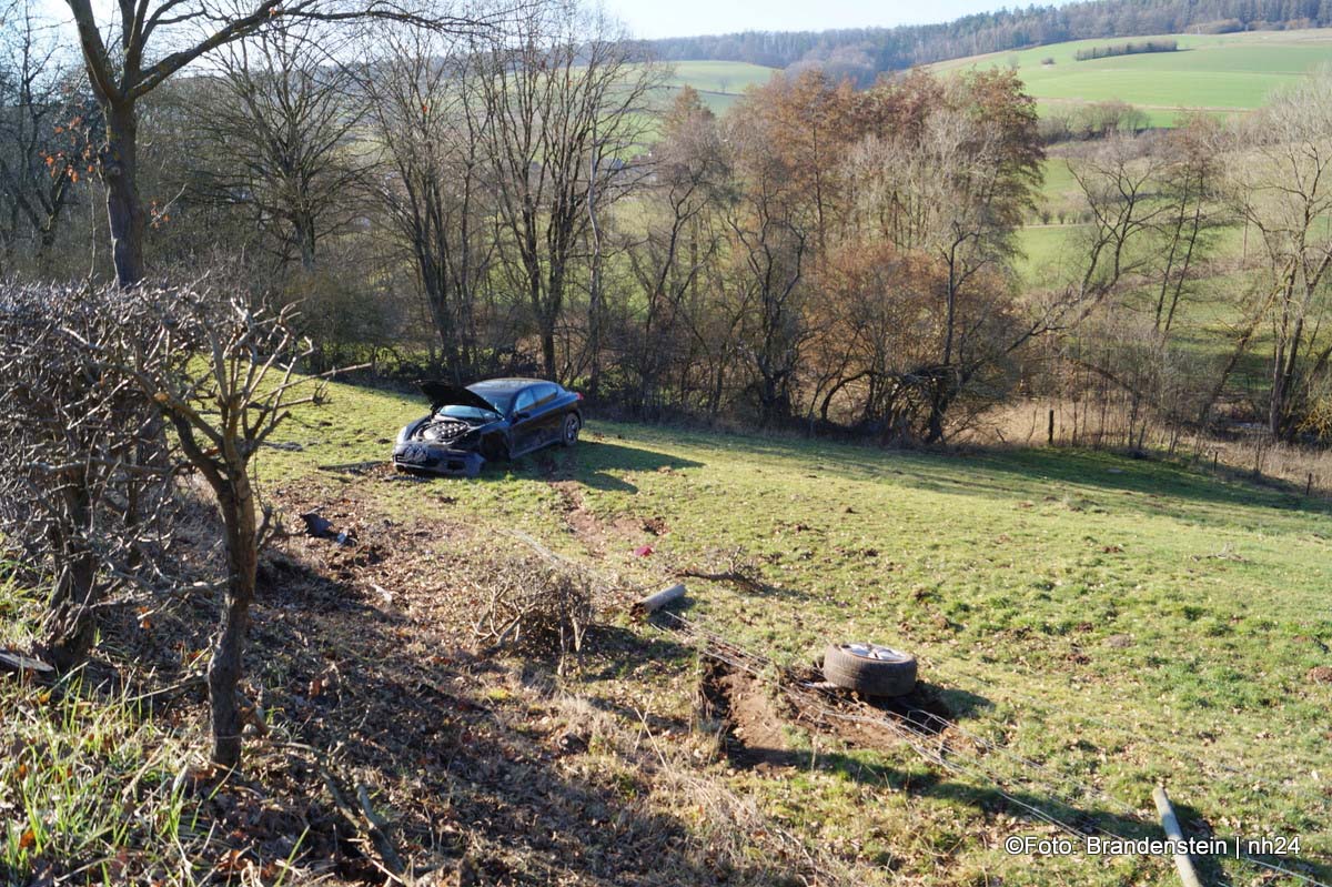 Der junge Mann aus Schwerte (Nordrhein-Westfalen) verlor gegen 14:30 Uhr in einer Rechtskurve die Kontrolle über den Pkw. Das Auto geriet nach links von der Fahrbahn ab und holperte rund 50 Meter durch den Straßengraben. Anschließend überquerte der mittlerweile stark beschädigte Pkw die Fahrbahn, rutschte einen ca. 5 Meter tiefen Abhang hinab und blieb auf einer Weide liegen. Bei dem Unfall durchstieß das Auto noch einen Zaun und riss sich ein Vorderrad ab.