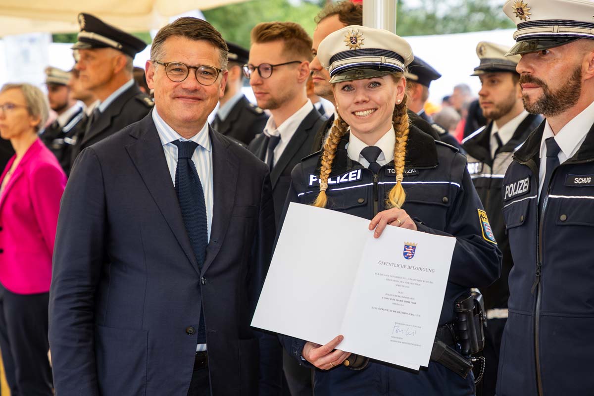 - Auf dem Weg zum Dienst reanimierten Polizeihauptkommissar Marcus Schug und Polizeioberkommissarin Constanze Marie Tometzki eine verunglückte Frau, die während der Autofahrt zusammengebrochen war. Für diesen Einsatz sprach ihnen Ministerpräsident Boris Rhein auf dem Hessentag in Fritzlar eine öffentliche Belobigung aus.