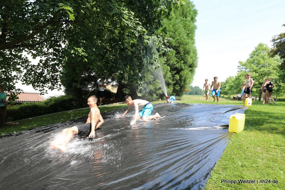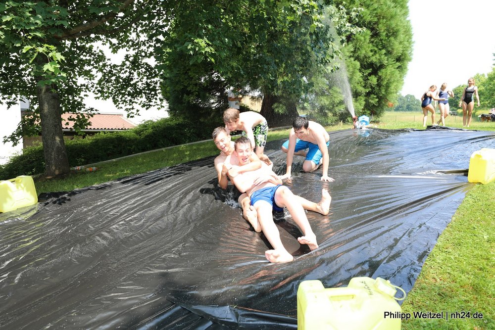 Schon beim Aufbau war der Feuerwehrnachwuchs mit viel Spaß bei der Sache. Schlauchleitungen wurden verlegt, eine Rutschfolie feinsäuberlich ausgebracht und Strahlrohre für die nötige Bewässerung in Betrieb genommen. Nach dem Aufbau hieß es dann mit „Karacho“ die Rutsche hinab. „Bei den Jungs und Mädels kam die Aktion richtig gut an“, so die Jugendwarte.