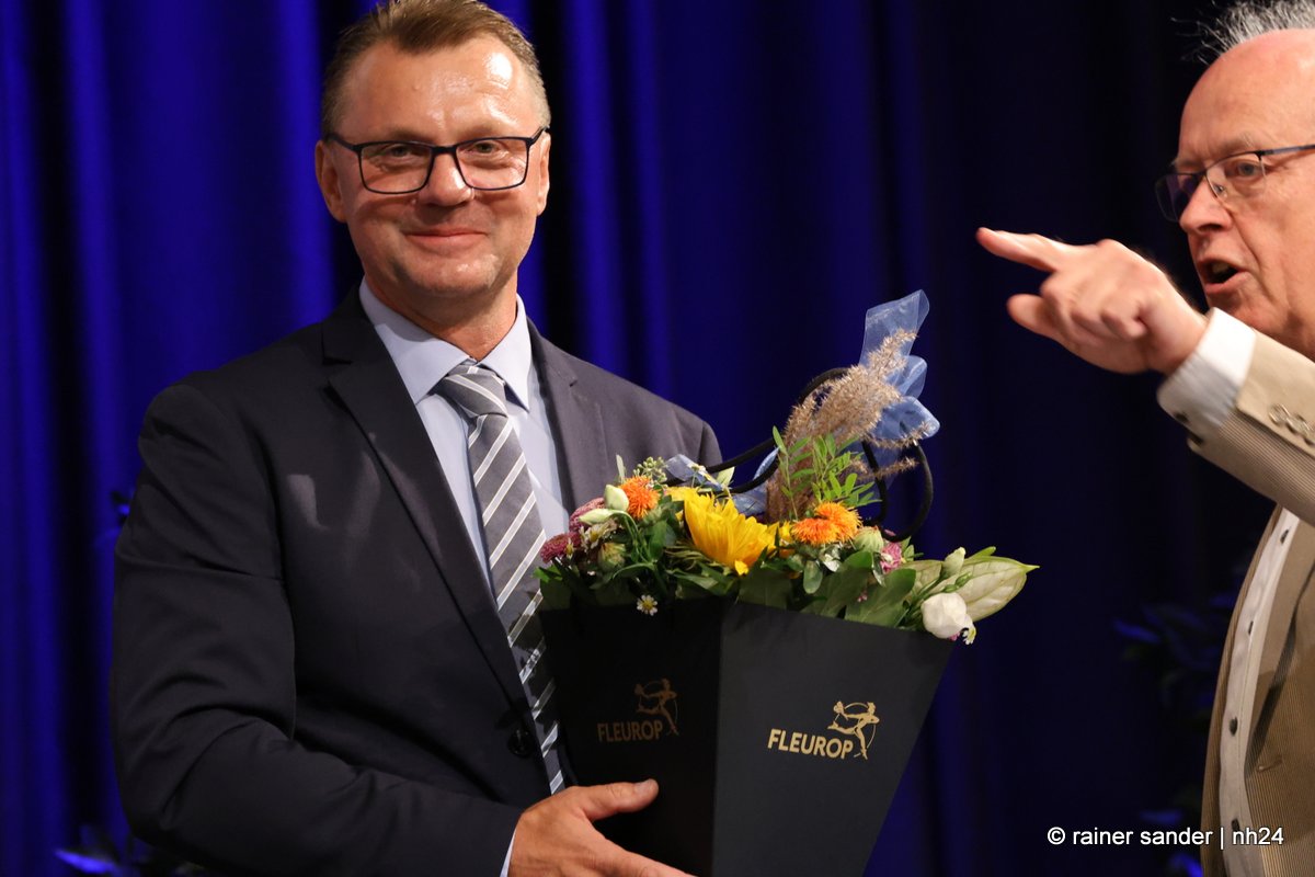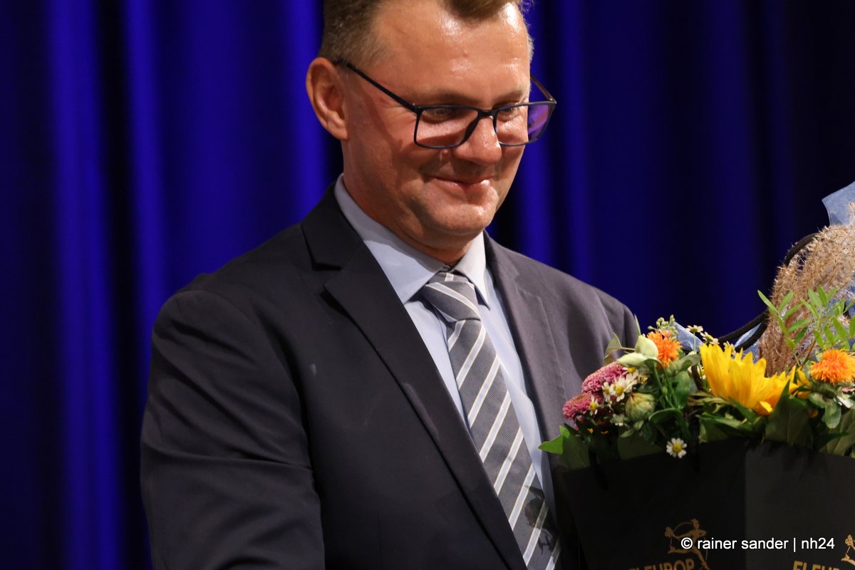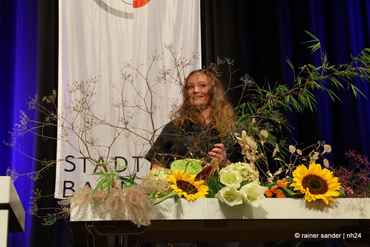 Kathrin Appel-Göllner, Präsidentin im Landesverband der Floristen, stellte einen Blumenstrauß zusammen aus hartwurzendem Bambus, aufstrebender Weißer Lilie, nach Geltung strebender Hortensie, Sonnenblume für Kinderlächeln, schlichtem Kohl, duftendem Rosmarin und Lavendel, eleganten Arthurienblüten, Strilizien, die in Campanula Partner finden, stacheliger Distel, internationalem Palmwedel und ein bisschen Glitzer. Der Bürgermeister sei der Faden, ohne den alles keinen Halt hätte: „Du musst uns alle zum Glänzen bringen!“