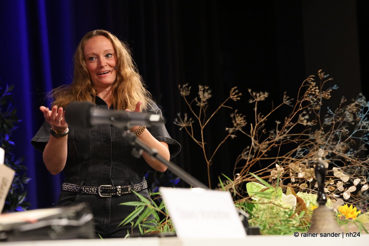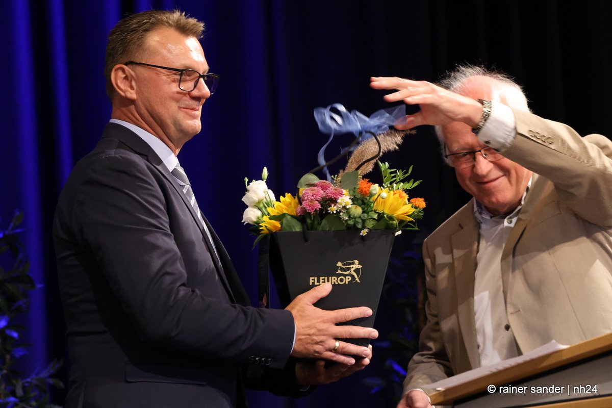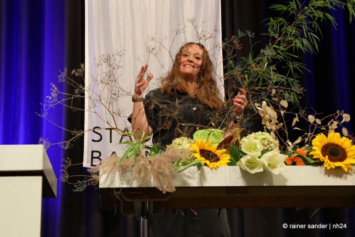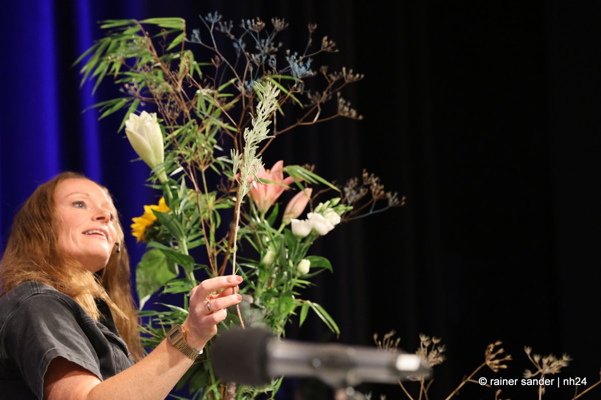 Kathrin Appel-Göllner, Präsidentin im Landesverband der Floristen, stellte einen Blumenstrauß zusammen aus hartwurzendem Bambus, aufstrebender Weißer Lilie, nach Geltung strebender Hortensie, Sonnenblume für Kinderlächeln, schlichtem Kohl, duftendem Rosmarin und Lavendel, eleganten Arthurienblüten, Strilizien, die in Campanula Partner finden, stacheliger Distel, internationalem Palmwedel und ein bisschen Glitzer. Der Bürgermeister sei der Faden, ohne den alles keinen Halt hätte: „Du musst uns alle zum Glänzen bringen!“