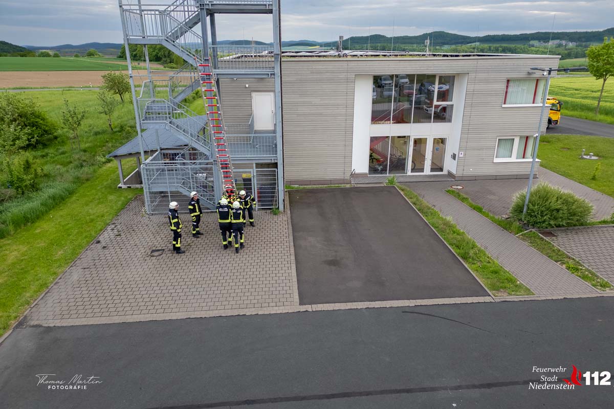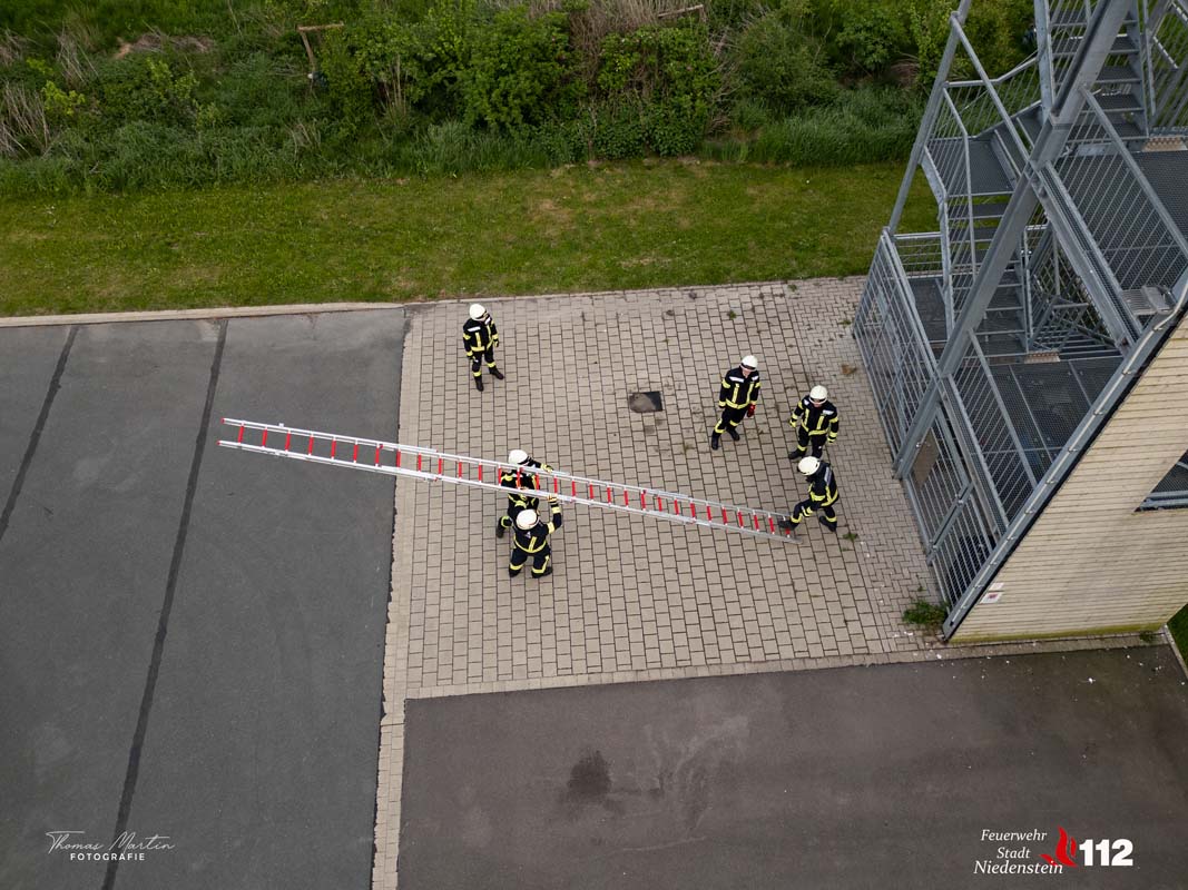 An der dritten Station vermittelte Mario Grunewald den richtigen Umgang mit tragbaren Leitern – vom Abnehmen über das Aufstellen bis zum sicheren Besteigen. Auch das Einsteigen durch Fenster sowie der fachgerechte Rückbau wurden geübt.