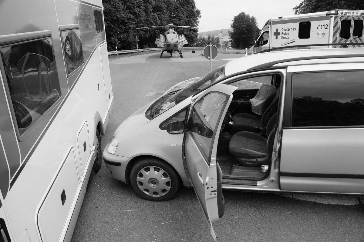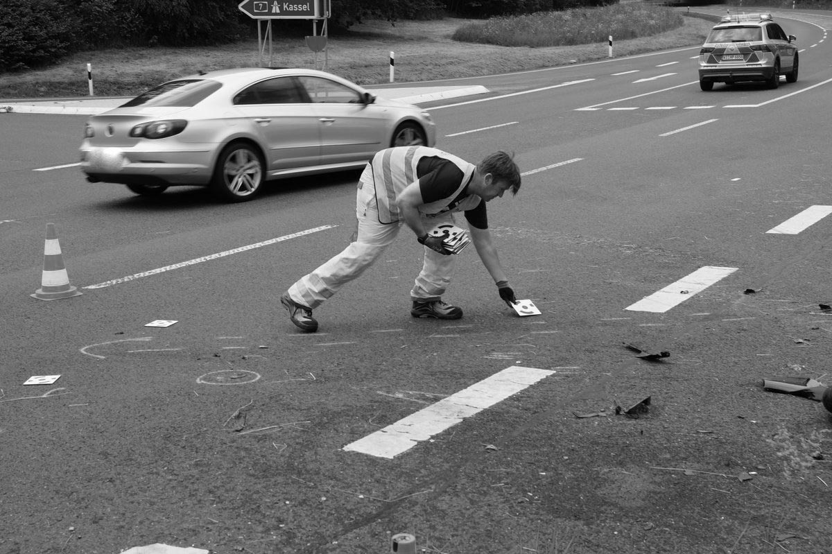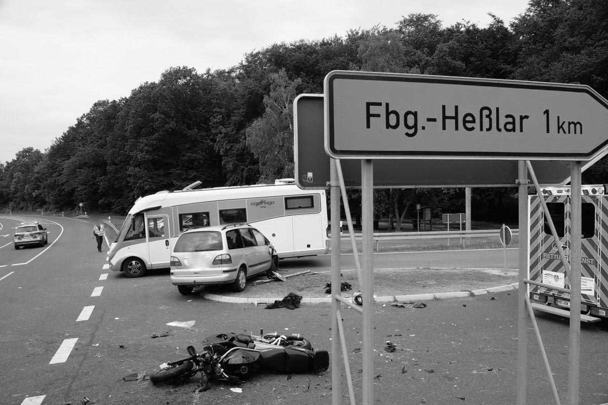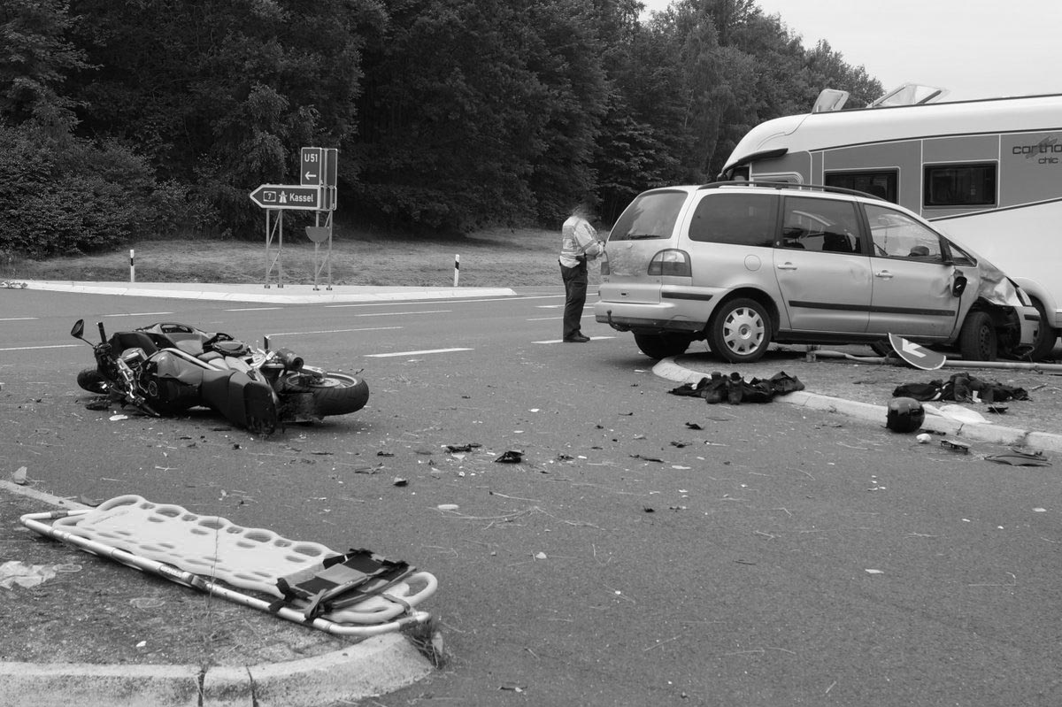 Laut Polizeiangaben fuhr ein 70-jähriger Mann aus Neukirchen mit seinem Pkw (Ford Galaxy) von der A 7 ab und übersah den in Richtung Felsberg fahrenden Motorradfahrer (45 aus Gudensberg) auf der Bundesstraße im Kreuzungsbereich nach Heßlar. Die beiden Fahrzeuge prallten zusammen. Der Motorradfahrer stürzte, der Ford überfuhr die Verkehrsinsel in Richtung Heßlar und kam an einem Wohnmobil zum Stehen, dessen Fahrer aus dem Landkreis Winsen an der Luhe auf die Autobahn auffahren wollte.