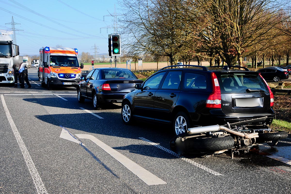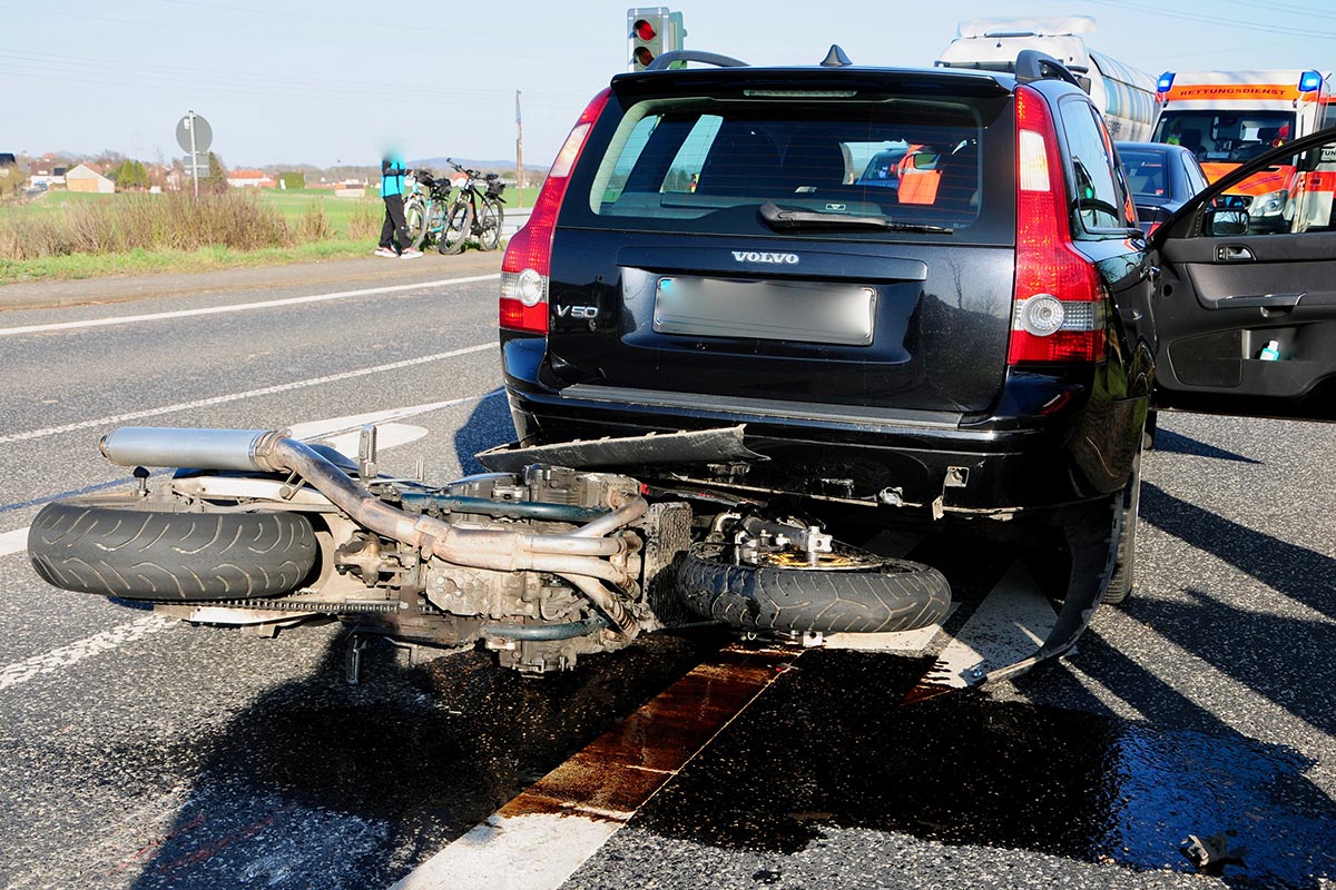 Zu dem Unfall kam es gegen 17:25 Uhr auf der Landesstraße zwischen der A 49 und Borken. In Höhe des Stockelache Sees musste eine 26 Jahre alte Autofahrerin aus Homburg/Saar ihren Pkw verkehrsbedingt bis zum Stillstand abbremsen. Dies übersah der folgende Zweiradfahrer. Er prallte ungebremst auf das Heck des Pkws, wurde rund zwölf Meter durch die Luft geschleudert und kam auf dem Asphalt der Fahrbahn zum Liegen. Das Motorrad wurde unter dem Pkw eingeklemmt.