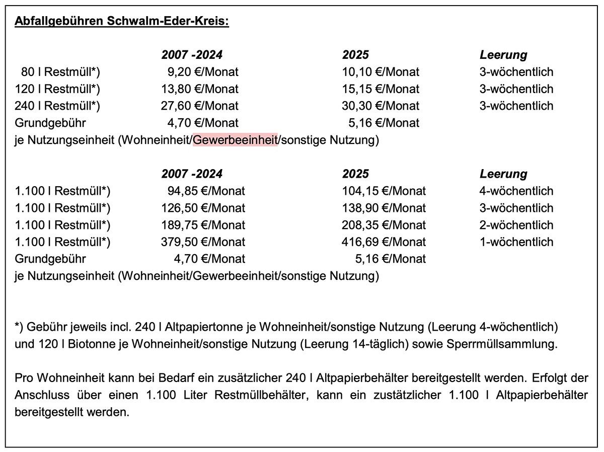 HOMBERG (EFZE). Erstmals seit 18 Jahren passt der Zweckverband Abfallwirtschaft Schwalm-Eder-Kreis (ZVA) die Müllgebühren an. Die monatliche Gebühr für die 80-Liter-Restmülltonne steigt ab Januar 2025 von 9,20 Euro auf 10,10 Euro, während die Grundgebühr je Wohneinheit um 46 Cent auf 5,16 Euro pro Monat erhöht wird.