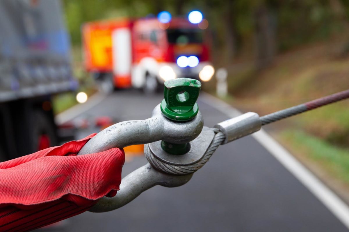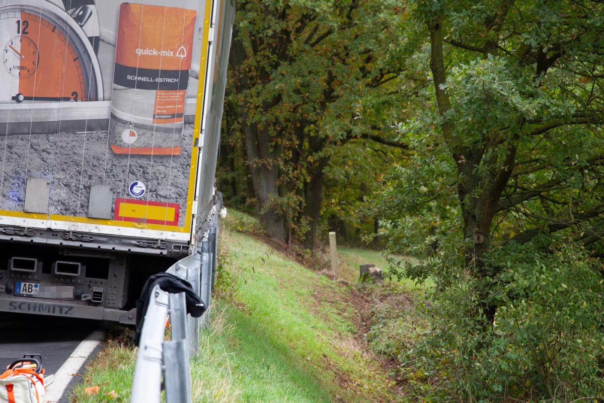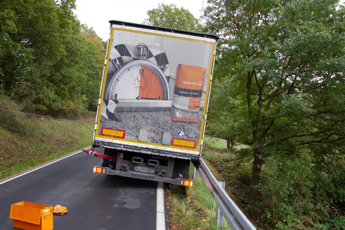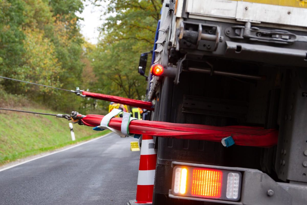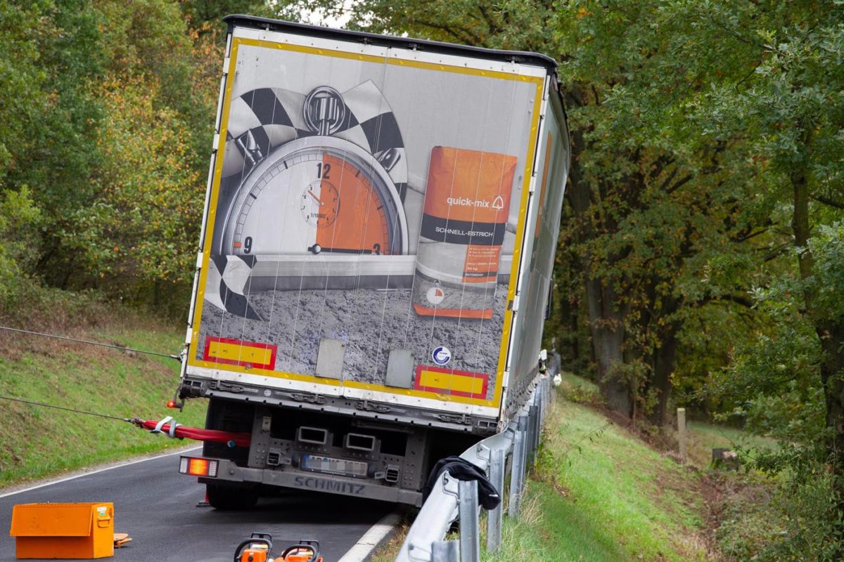 Bis zum Eintreffen eines Berge-Lkw sicherten Feuerwehrleute den Sattelzug gegen ein weiteres Abrutschen ab.
