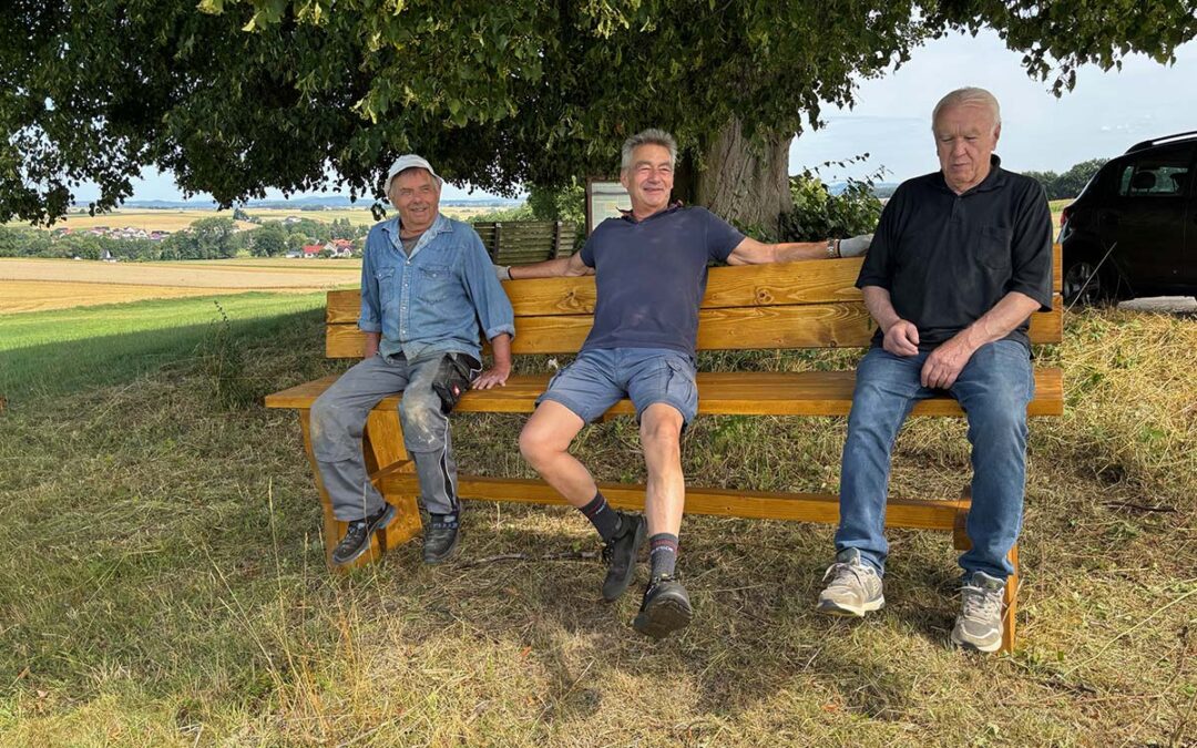 Willi Miksch, Norbert Pauli und Konrad Schultheis testen die neue Baumelbank (wal)
