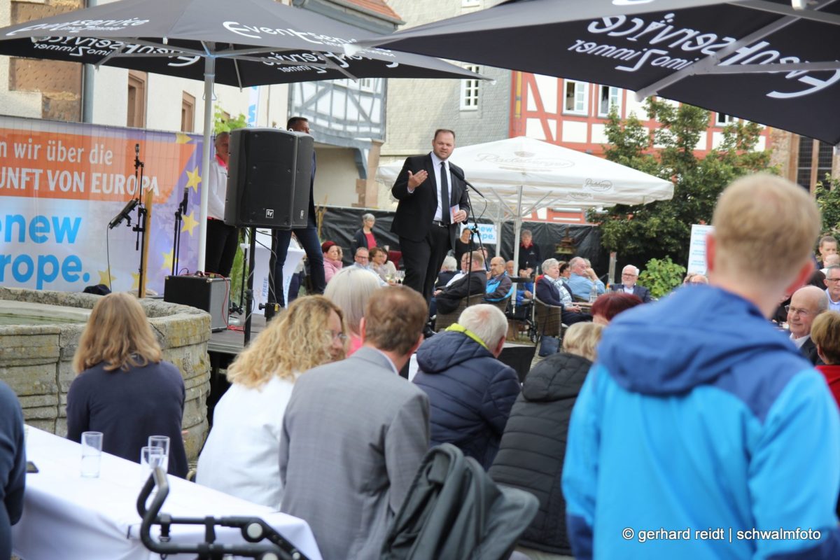 Dirk Röder griff gerne das Motto „Renew Europe“ auf und spannte den Bogen bis in die Entstehungszeit von Festungen, als man mit ihnen noch Bedrohungen und Angriffe abwehren konnte. Ziegenhain gehörte zu den ersten, die auch Feuerwaffen standhalten konnten. Eine moderne Anlage in einem sich schon damals wandelnden Europa. Heute, so Röder, gibt es nicht ein einziges Bauwerk mehr, welches einen Angriff standhalten könnte. Nicht nur Kriege werden anders geführt, auch Auseinandersetzungen. Und damit gibt auch das historische Ziegenhain Europa ein Profil. Wie Schwalmstadts parteilose Bürgermeister Stefan Pinhard sagte, wir sind 0,004 % von Europa.