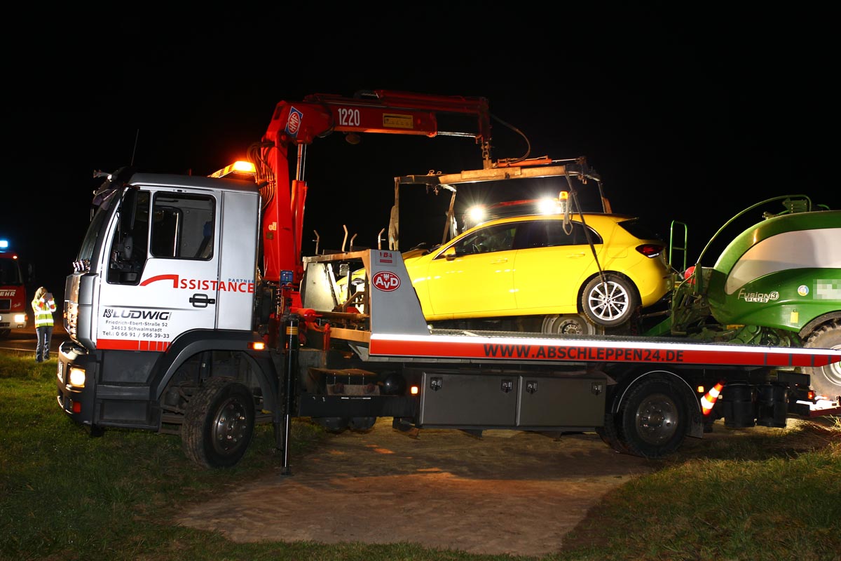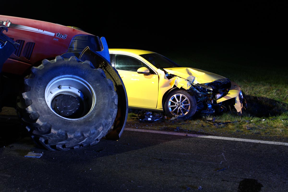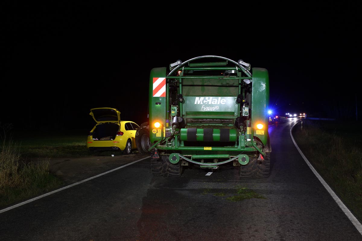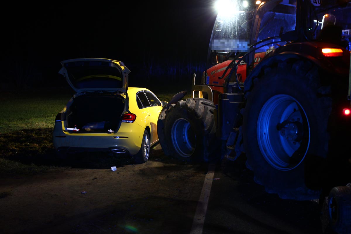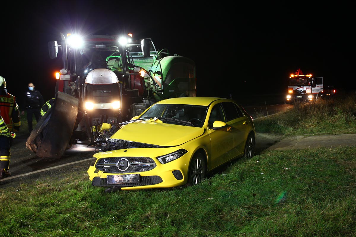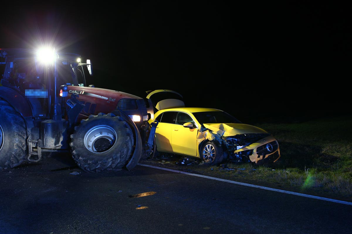 Zu dem Unfall kam es kurz vor 18:30 Uhr. Beide fuhren nach dem kurvigen Abschnitt hinter Schlierbach weiter in Richtung A 49/Waltersbrück. Als die Strecke frei war und kein Gegenverkehr kam, scherte der 33-jährige Neuentaler auf die Gegenfahrbahn aus, um das vorausfahrende Traktorgespann zu überholen. Das Überholen ging bis zur Vorderachse des Traktors gut, dessen Fahrer, 20 Jahre alt und ebenfalls aus Neuental, nach eigenen Angaben links blinkte und auch in diese Richtung auf einen Wirtschaftsweg abbiegen wollte. Die beiden ungleichen Fahrzeuge kollidierten seitlich miteinander, wodurch die Vorderachse des Traktors nachgab und der Pkw auf der Beifahrerseite schwerbeschädigt wurde. Der Mercedes geriet noch von der Fahrbahn ab und kam auf dem Randstreifen der Fahrbahn zum Stillstand. Das ebenfalls nicht mehr fahrbereite Traktorgespann blieb auf der Straße stehen.