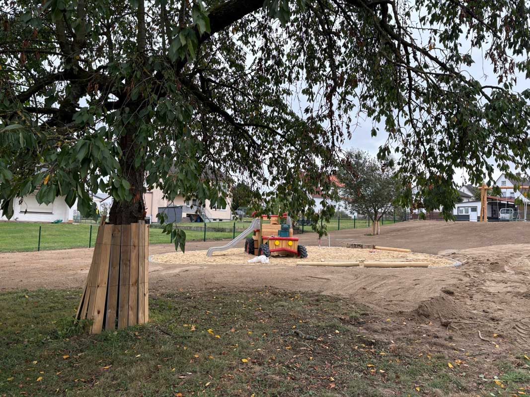 Die Planung orientierte sich am Konzept der künftigen KiTa und greift das Thema „Bauernhof“ auf. Verwendet wurden Naturmaterialien wie Robinienholz und Naturstein, ergänzt durch verschiedene Spielbereiche, die Funktionen eines Bauernhofs darstellen.