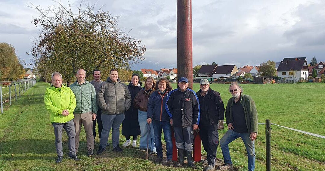 Unter Anleitung des Fördervereins Kulturlandschaft Schwalm e. V. und mit Unterstützung von Ortslandwirt Hans-Wilhelm Hainmüller bauten die Teilnehmenden zunächst eine Nistplattform aus Naturmaterialien. Anschließend wurden die Fundamentarbeiten mit Hilfe des städtischen Bauhofs ausgeführt. Am 27. Oktober 2025 konnte der Mast schließlich mit Unterstützung von Jörg Haafke und Alfred Kuhn vom Förderverein aufgerichtet werden.