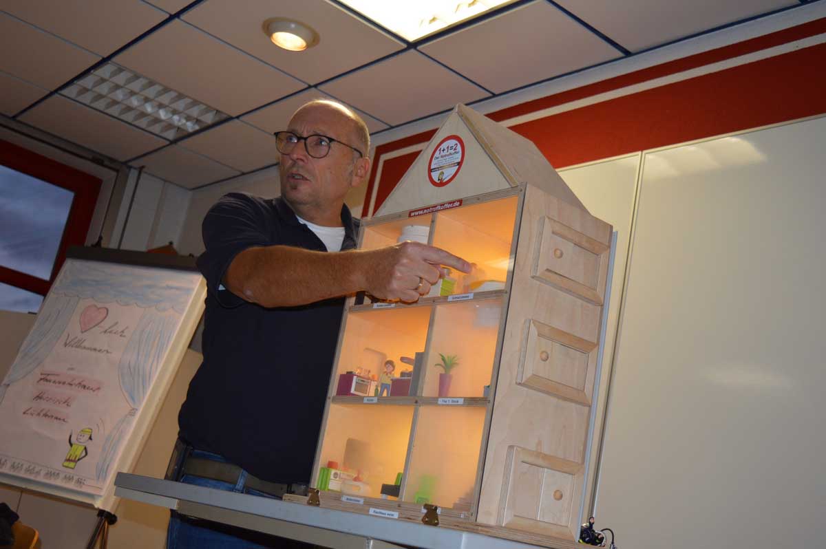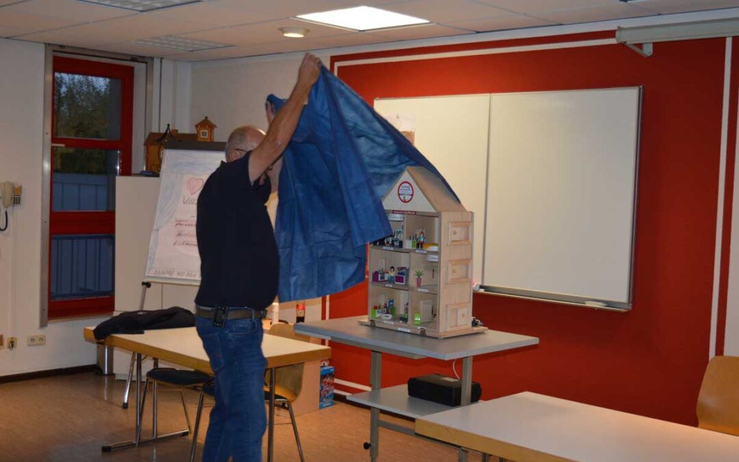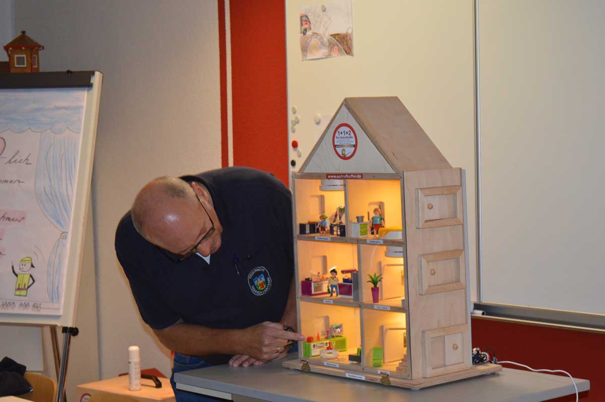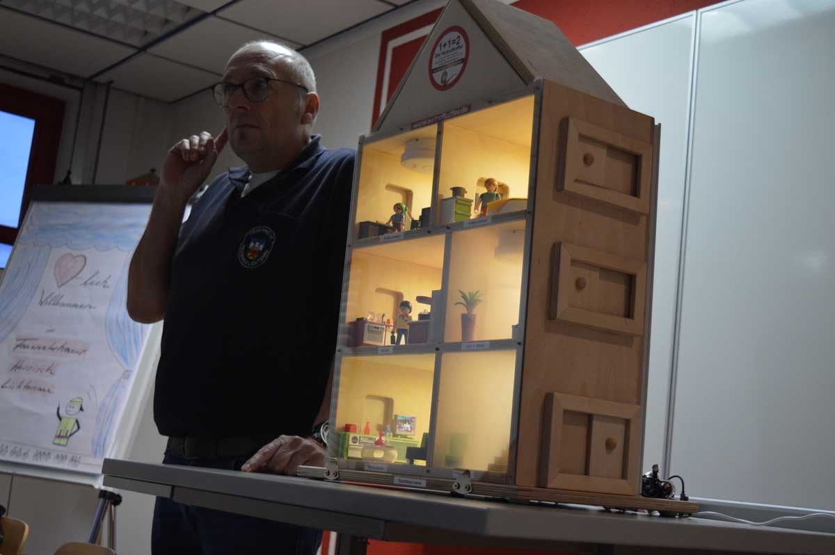 Das aus Holz und Plexiglas gefertigte Rauchhaus lässt sich über Schalter gezielt verrauchen. Es verdeutlicht, was passiert, wenn Türen oder Fenster geöffnet werden, und hilft, das richtige Verhalten im Brandfall zu vermitteln. Bereits bei der ersten Vorführung zeigten die Kinder ihr Wissen und führten mit Schröder gemeinsam einen simulierten Notruf durch.