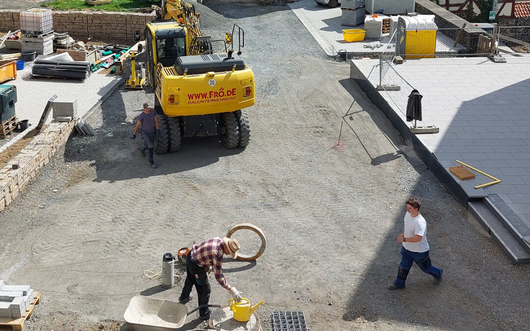 Die Neugestaltung des Innenhofs, gelegen an der Engen Gasse oberhalb des Vorplatzes, stellte die Handwerker vor herausfordernde Aufgaben. Es ist geplant, diverse Aufenthaltsbereiche zu schaffen. Die Pflasterarbeiten in der Engen Gasse sind momentan im Gange. Pflanzgruben für die Bäume werden in dieser Woche vorbereitet, und die Bäume sollen voraussichtlich in zwei Wochen gesetzt werden. Eine Terrasse vor dem Multifunktionsgebäude und ein kleiner, baumbestandener Platz in der Nähe des Familienzentrums mit Elternschule werden das Bild des neuen Innenhofs prägen. Zudem sind für den Innenhof Sitzauflagen auf der Gabionenmauer und weitere Fahrradbügel vorgesehen. Eine wassergebundene Decke sowie die Treppenanlage werden zu einem späteren Zeitpunkt fertiggestellt.