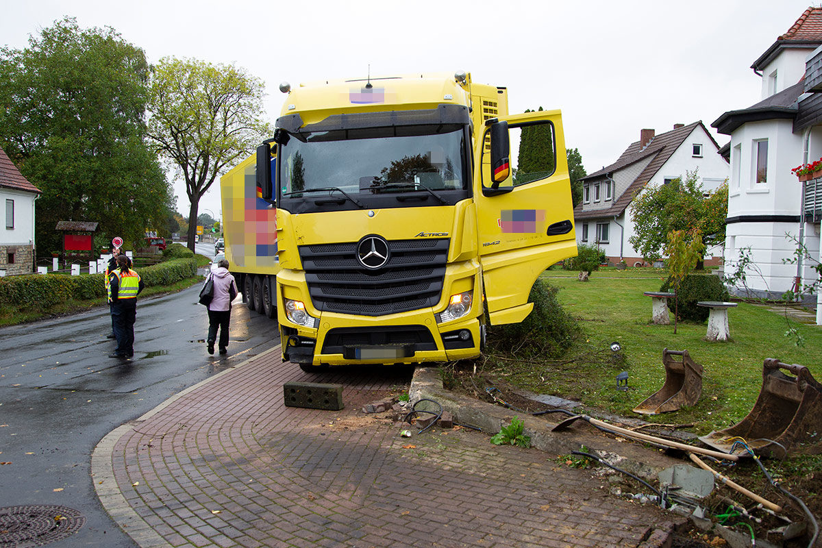 Wie ein Polizeisprecher in Schwalmstadt berichtet, war der Lkw-Fahrer (53) zur Unfallzeit in Richtung Asterode unterwegs. In einer Rechtskurve fuhr er aus bislang unbekannten Gründen geradeaus. Der Sattelzug überquerte den Gehweg, prallte gegen eine Grundstückseinfriedung, fällte eine Laterne und ein Verkehrszeichen und letztendlich auch den Stromkasten. Versuche, den Lkw rückwärts vom Grundstück zu fahren scheiterten.