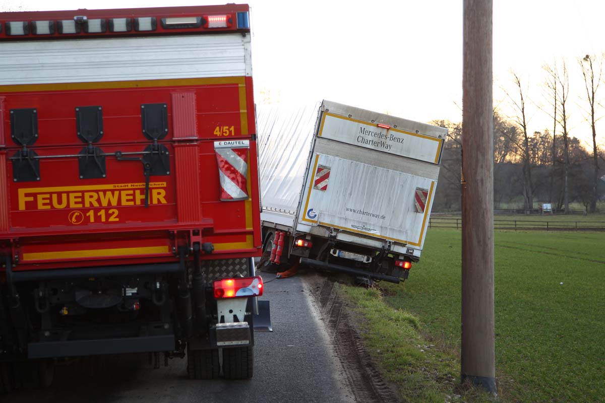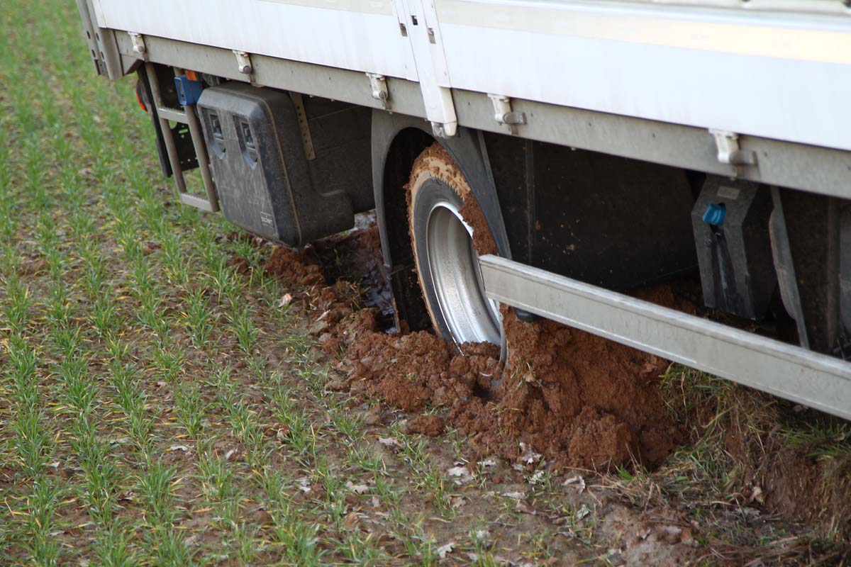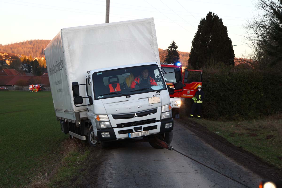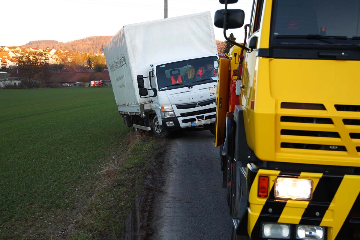 Die Fahrerin geriet auf die aufgeweichte Bankette des Wirtschaftsweges. Diese gab nach und der Lkw rutsche wenige Zentimeter hinab auf ein Feld. Zuwenig, um beschädigt zu werden, aber immerhin tief genug, dass der Lkw nicht mehr aus eigener Kraft zurück auf die Fahrbahn kam.