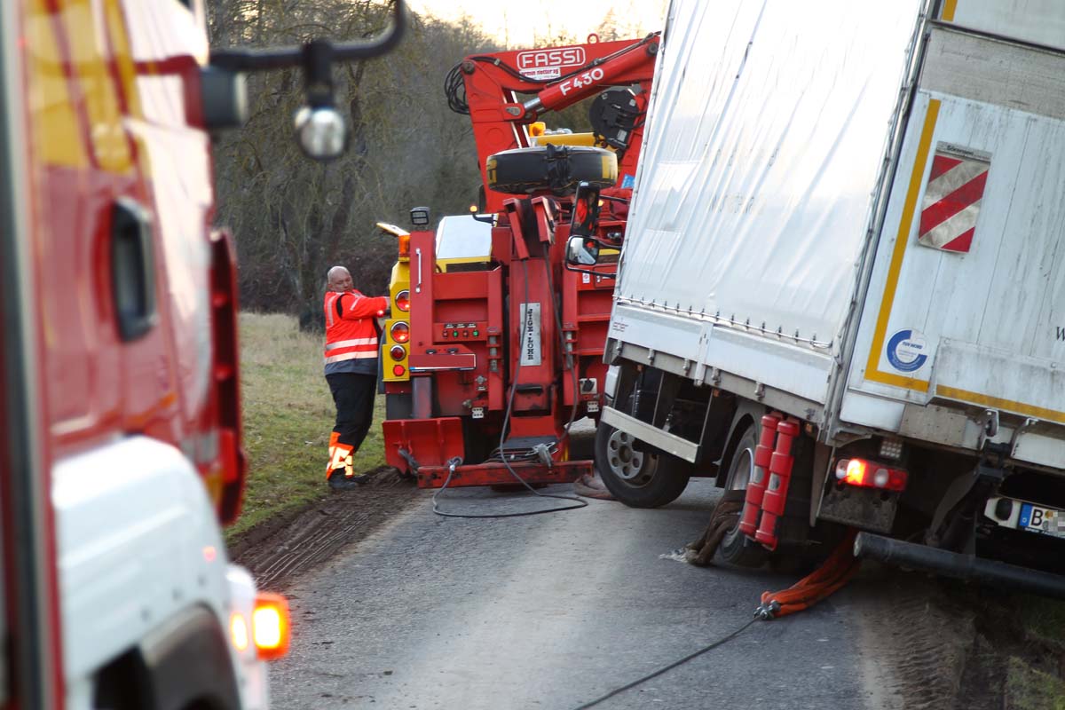 Auf der Umgehung zwischen Neukirchen und Rückershausen drohte ein Lkw umzukippen. Die Feuerwehrleute sicherten den Mitsubishi bis zum Eintreffen des Bergungsunternehmens Ludwig aus Treysa ab.
