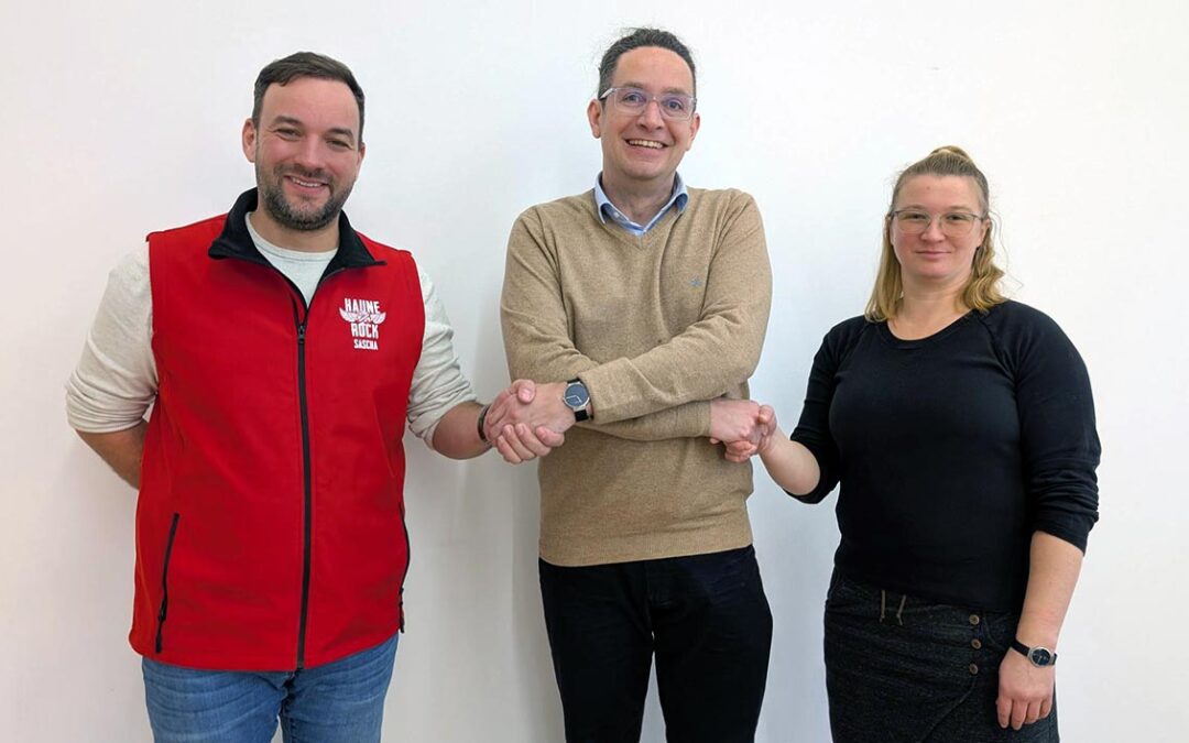Sascha Ruppert als Mitorganisator von Haune-Rock GmbH, NVV-Geschäftsführer Marian Volmer und Katharina Griesel als Referentin Unternehmenskommunikation und Fundraising Kleine Riesen Nordhessen gGmbH gemeinsam bei der Übergabe der Jahresspende (wal)