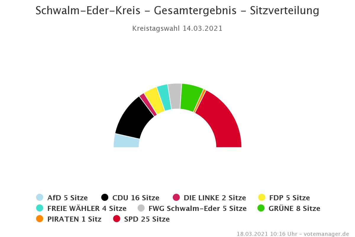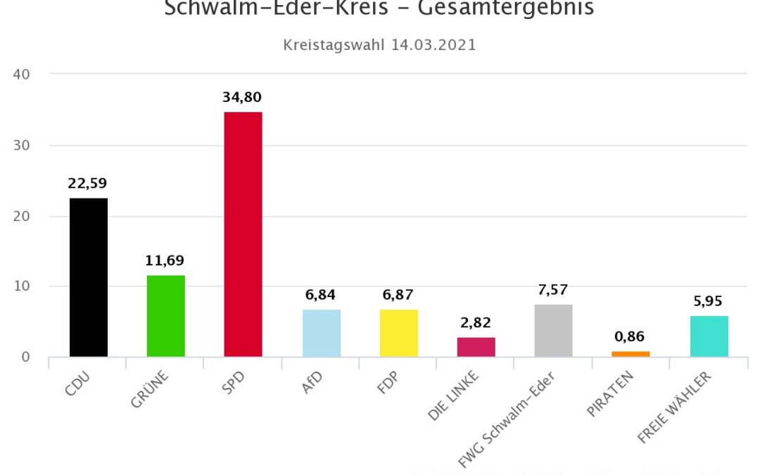 Die Eingangsüberlegungen nützen nun alle nichts mehr! Die Wählerinnen und Wähler zwischen Niedenstein und Ottrau, Gilserberg und Spangenberg haben entschieden: die SPD hat nur noch 34,8 Prozent der Stimmen (3,9 Prozent weniger) und als einziger, alleiniger Partner käme die CDU mit 22,6 Prozent (2,2 Prozent weniger als 2016) infrage. Ob die zwei das so wollen? Alles andere wird schwierig. Zusammen mit den GRÜNEN (4,4 Prozent mehr) ginge es dann mit jedem anderen, weiteren Partner. Nun waren die GRÜNEN im Kreis bisher nicht so „kuschelig“ gegenüber der SPD. In einer Partnerschaft mit der bisherigen FWG (2,5 Prozent weniger) würde es auch bei einem „Dreier“ mager aussehen. Und dass FWG (Freie Wählergemeinschaft) und FW (Freie Wähler), die auf Anhieb 6 Prozent schafften gemeinsam regieren wollen, dürfte derzeit das unwahrscheinlichste überhaupt sein.