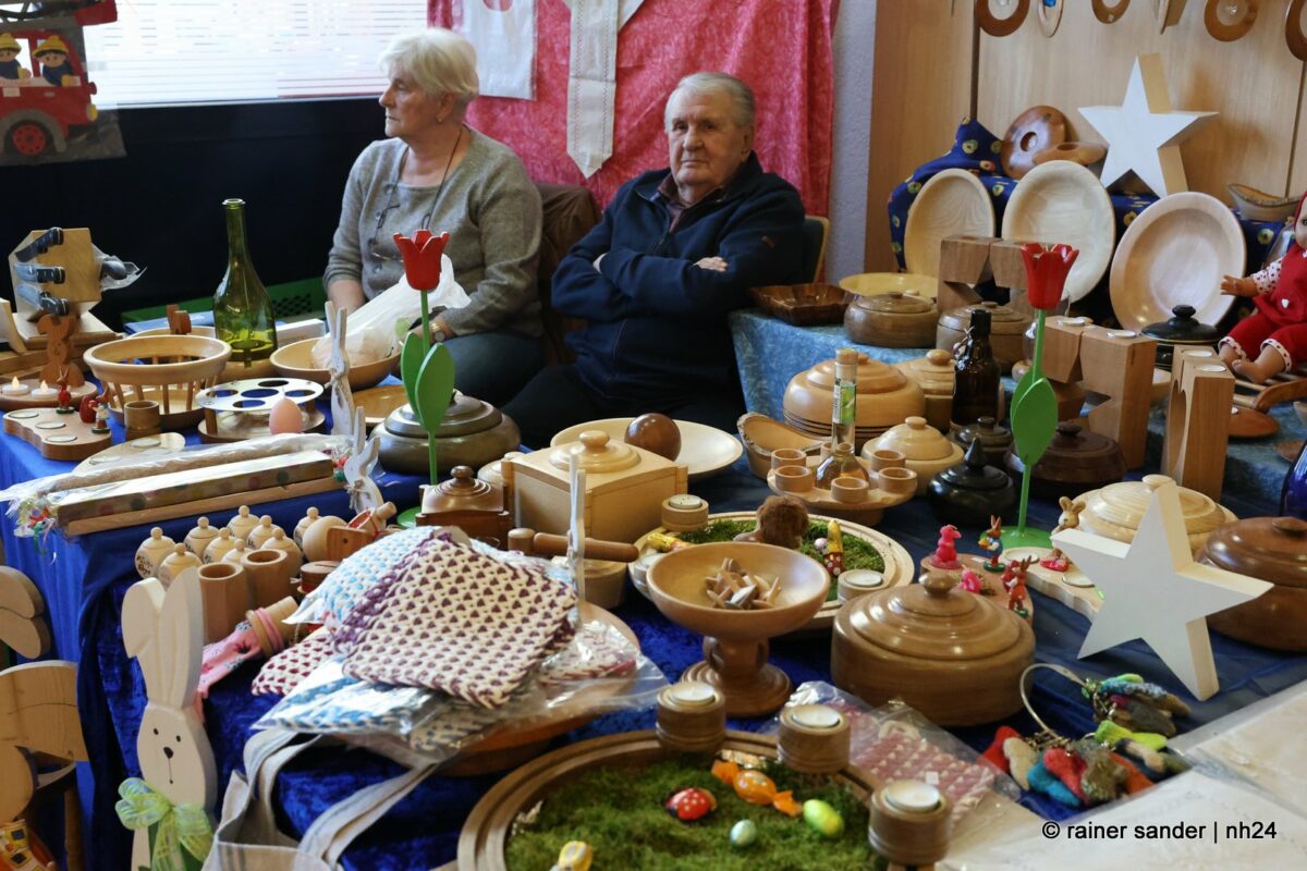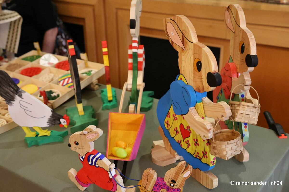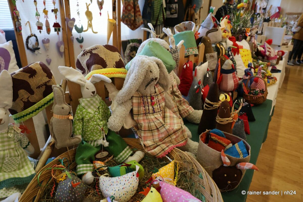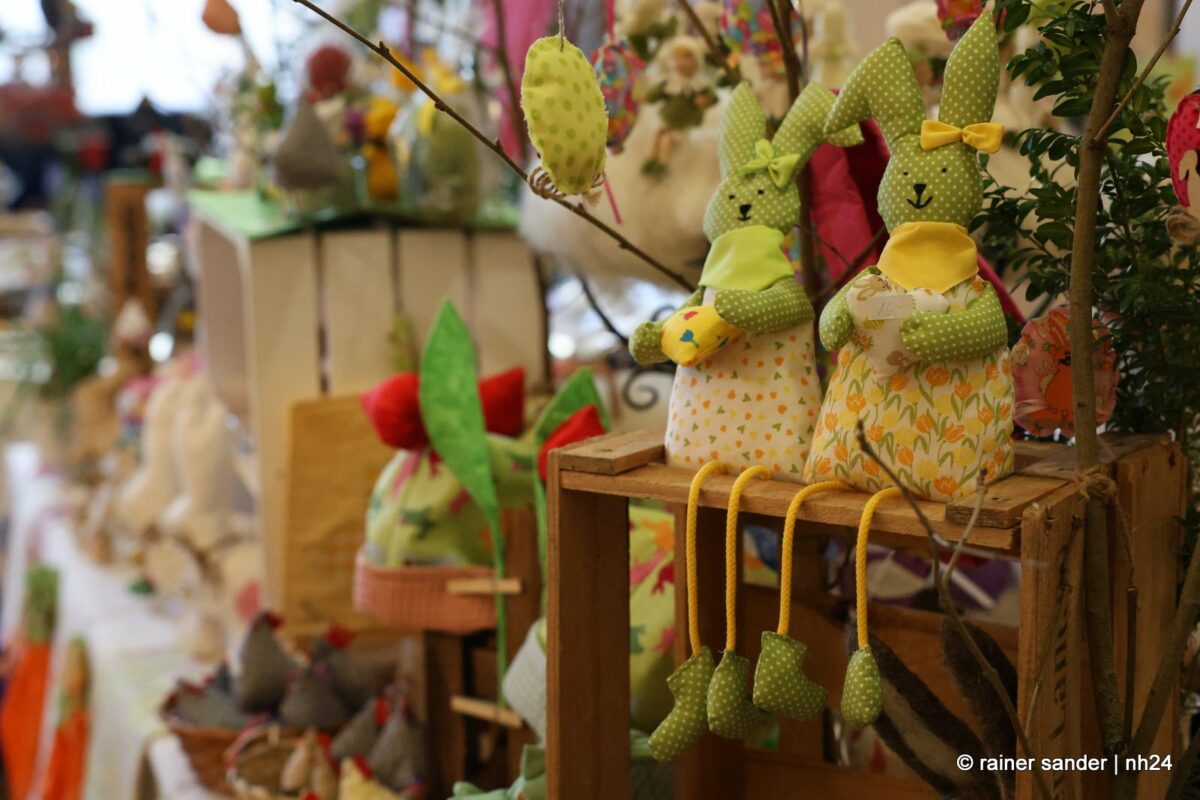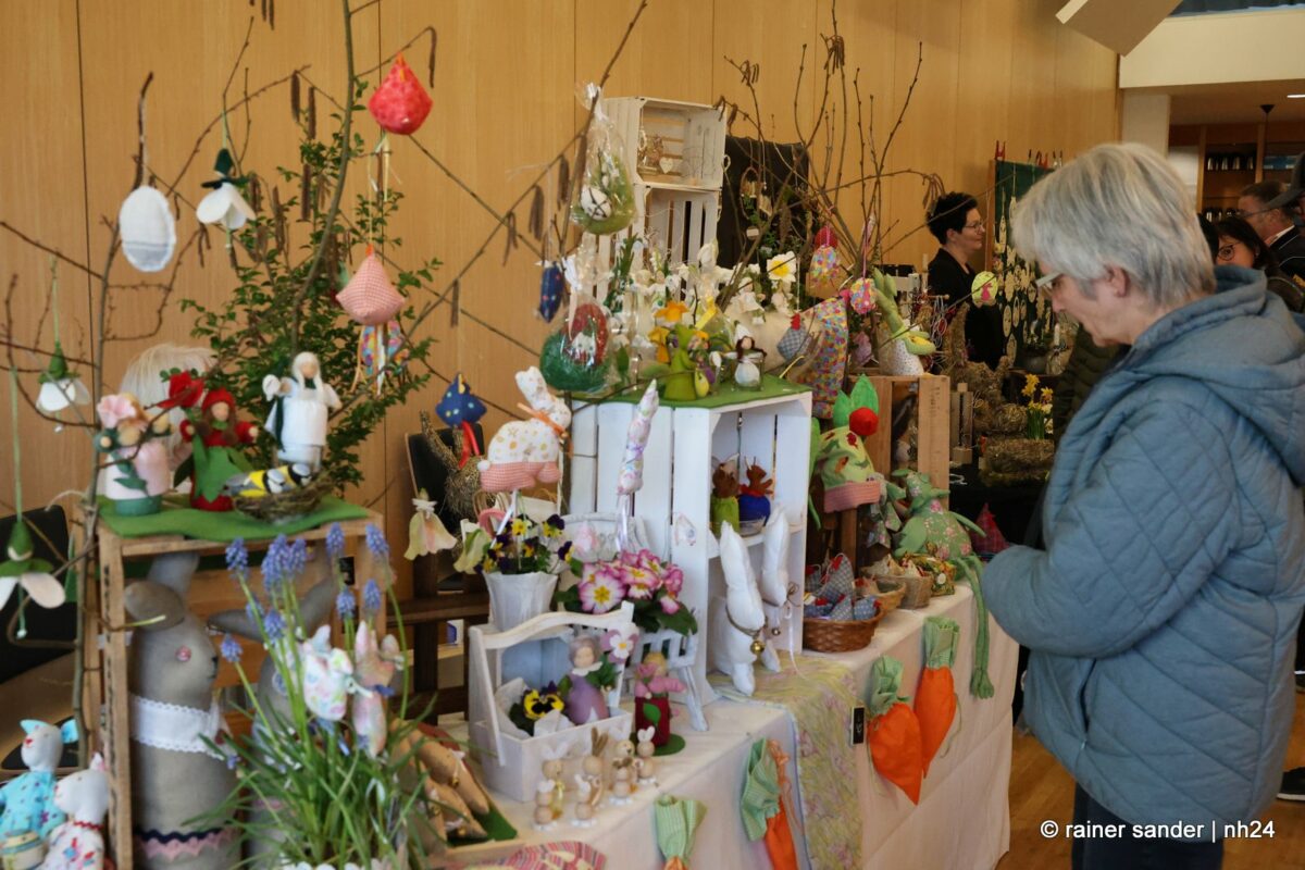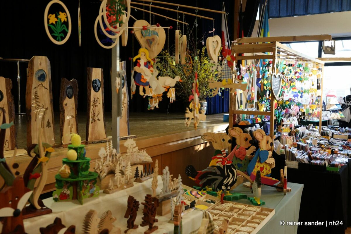 Im Bürgerhaus präsentierten die Kunsthandwerker der Region, was sie ein Jahr lang zu Ostern produziert haben. Viel Nützliches, Dekoratives und „schönes Unnützes“. Vieles zum Verschenken, manches zur Deko für zu Hause. Da duftete es – außer nach Kaffee und Kuchen am Nachmittag – nach Lavendel oder Seife. Es glitzerten Edelsteine und Porzellaneier. Dort lagen bunte Eier, hier gab es aus Holz geschnitzte Osterhasen. Oder wie wäre es mit fantasievoll gestalteten Osterkarten?