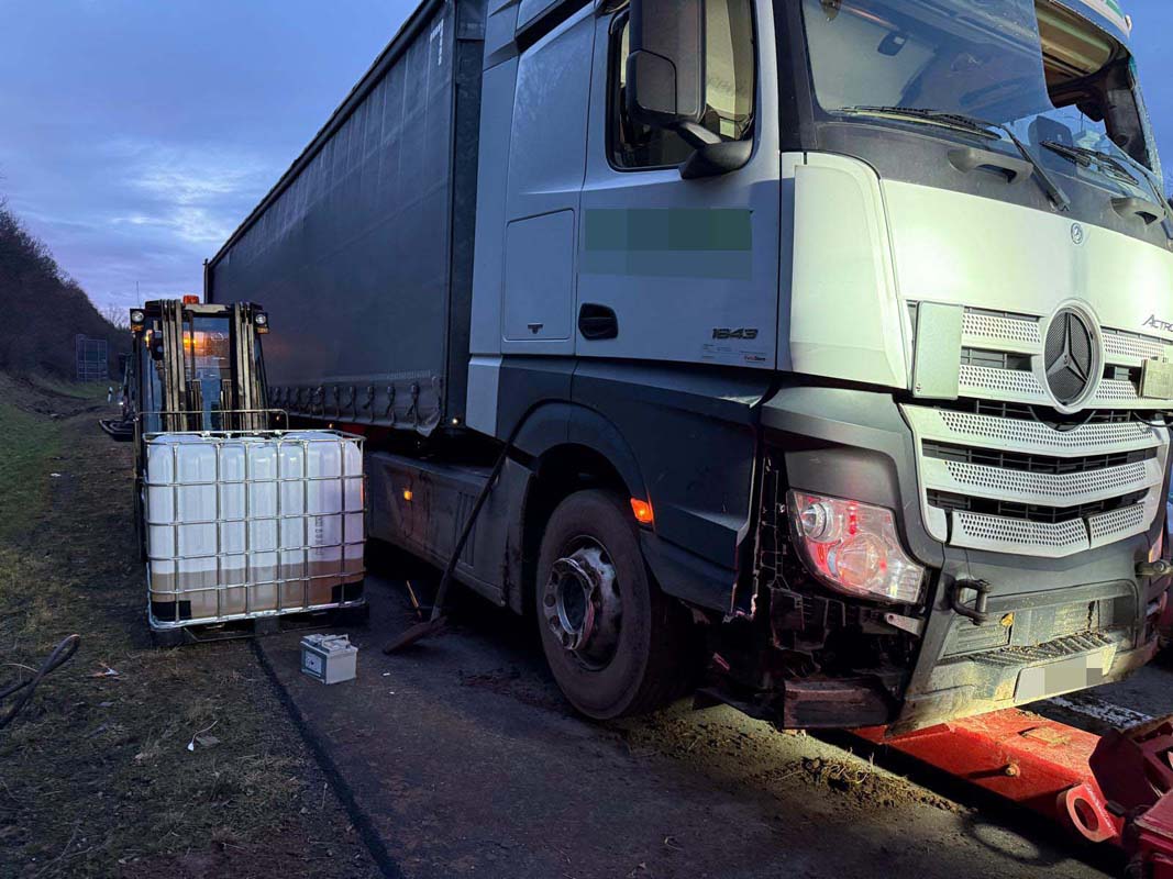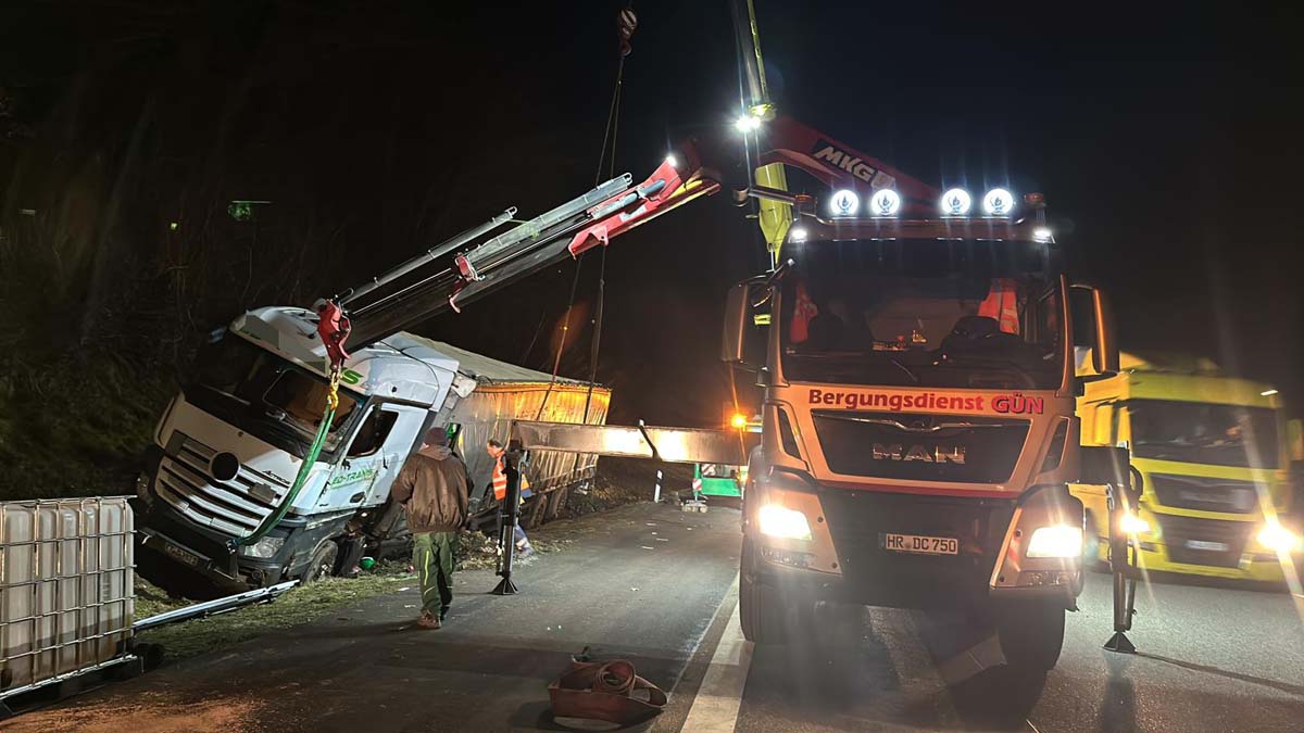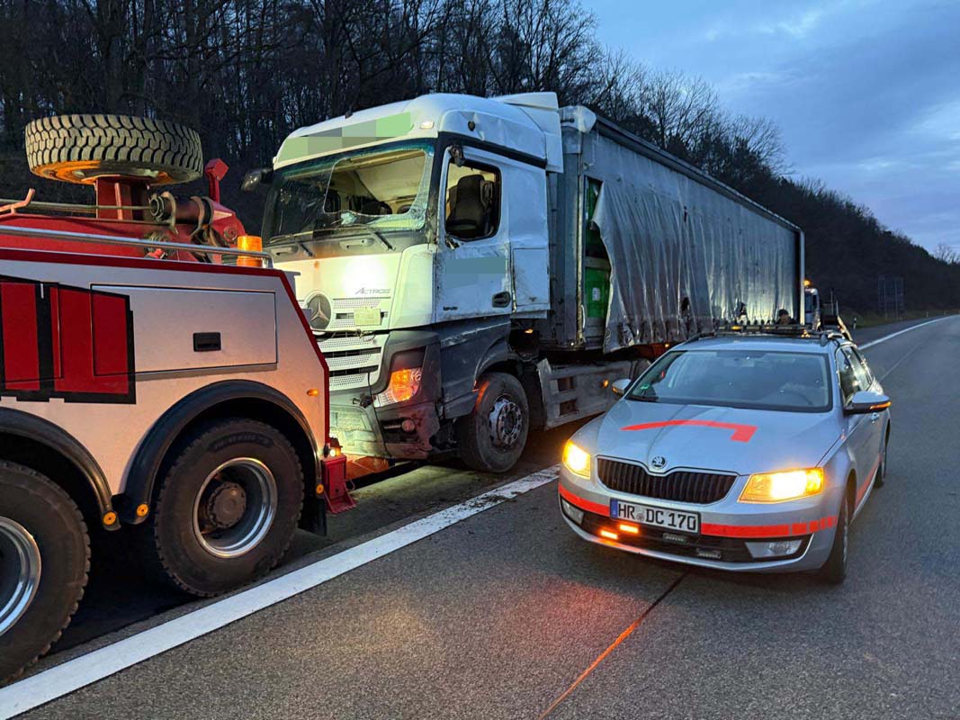 Ersthelfer unterstützten den leicht verletzten Fahrer beim Verlassen der Fahrerkabine. Er wurde vor Ort medizinisch versorgt und anschließend in ein Krankenhaus gebracht. Die Bergungs- und Reinigungsarbeiten dauerten mehrere Stunden, weshalb die rechte Spur gesperrt werden musste. Feuerwehr, Rettungsdienst, Autobahnmeisterei, die untere Wasserbehörde und die Polizei waren im Einsatz. Der Sachschaden wird auf rund 60.000 EUR geschätzt.