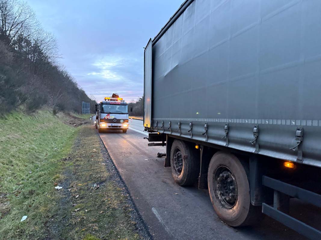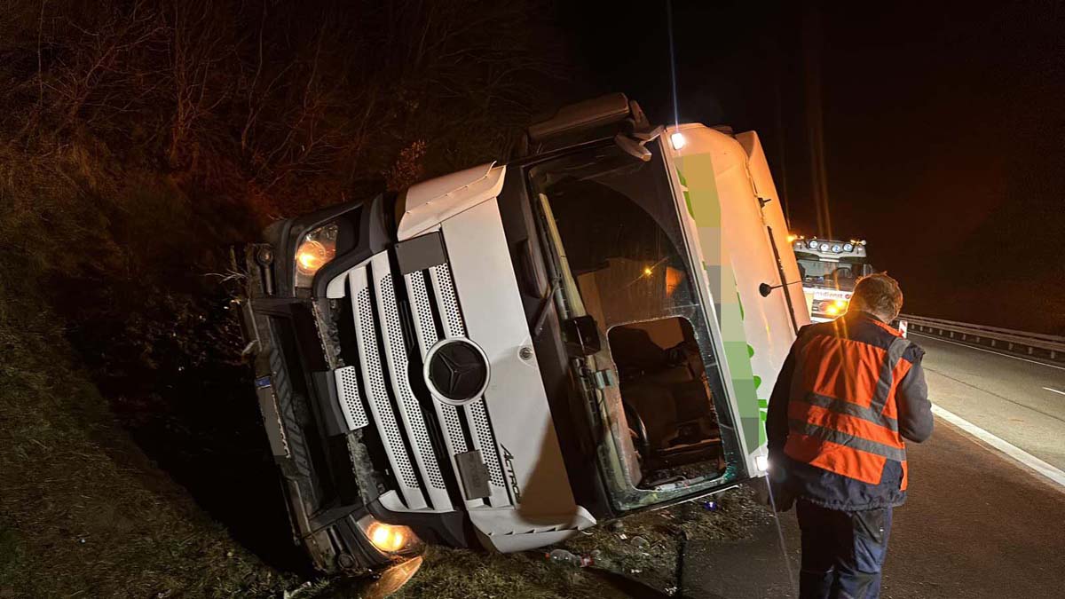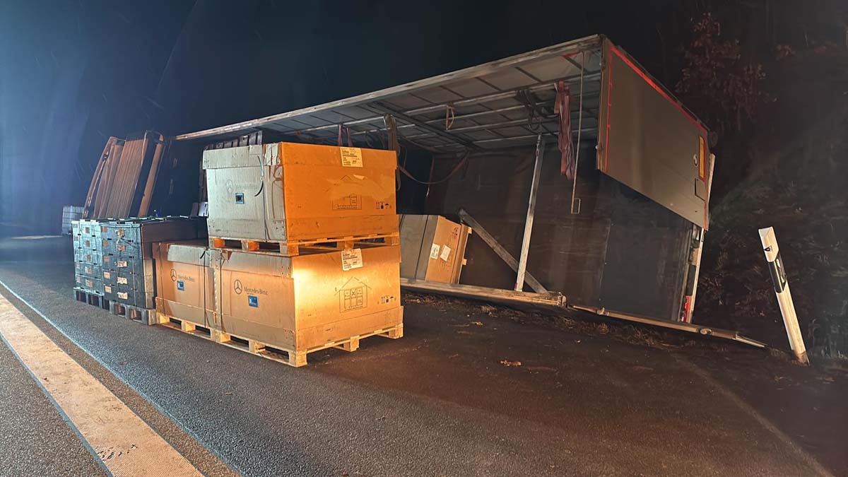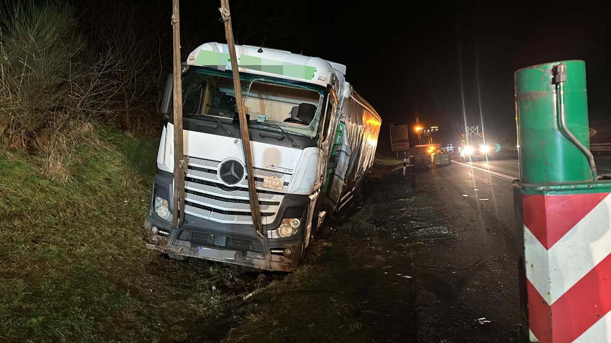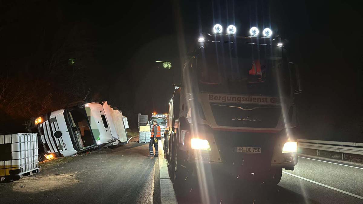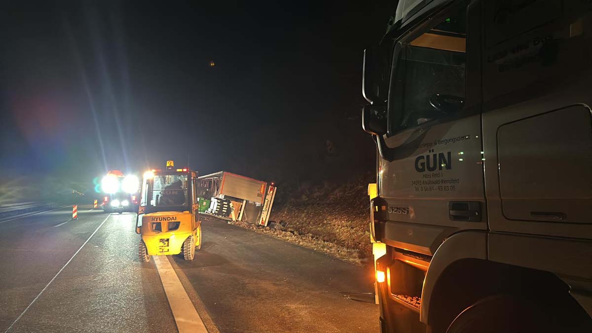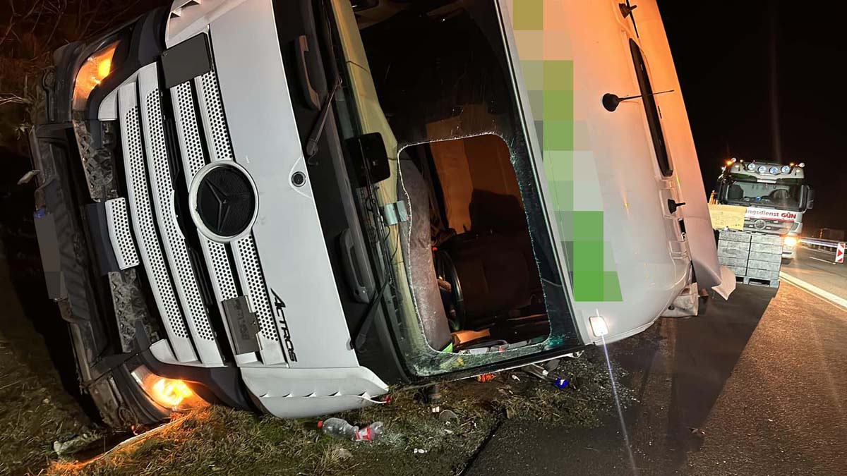 Lkw kippt nach medizinischem Notfall des Fahrers auf der A 7 um
