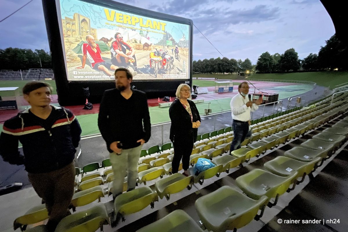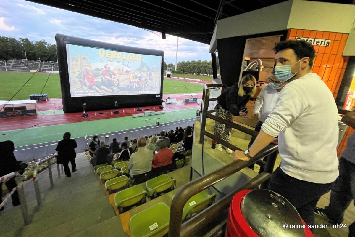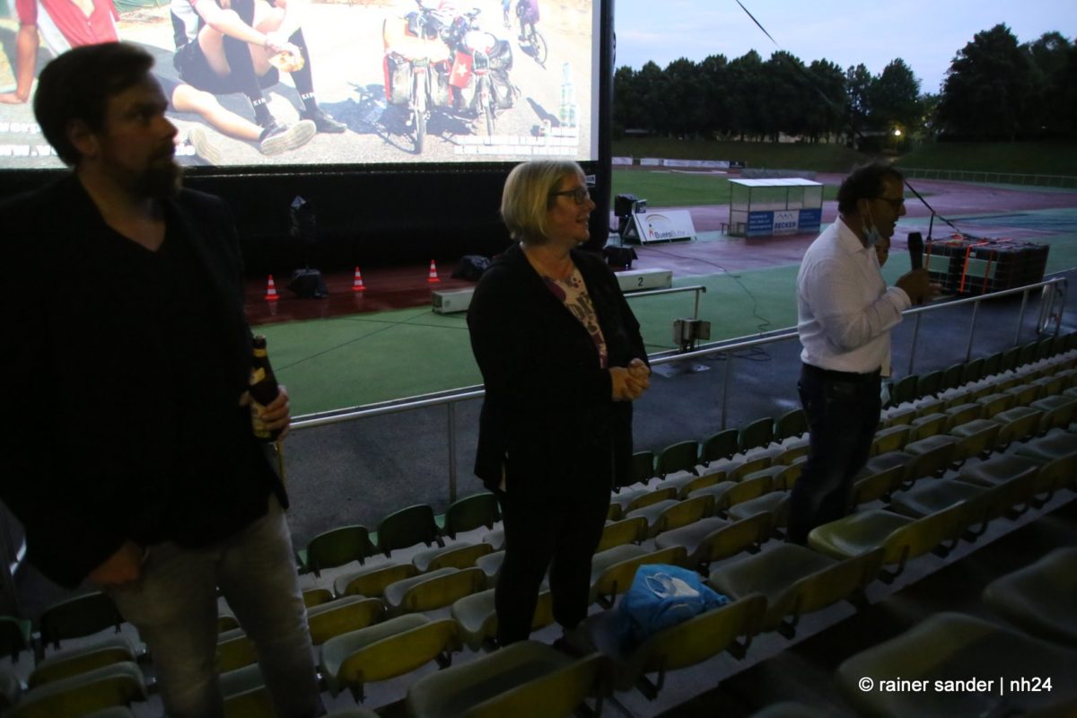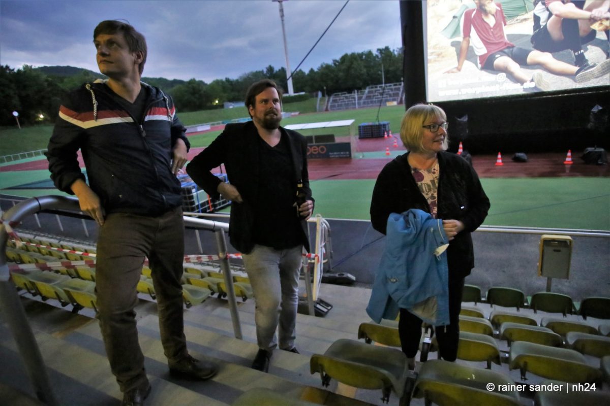 Silke Engler fasste die allgemeine Stimmungslage mit den Worten zusammen „Corona nervt“ und kokettierte ein wenig mit dem Baunataler Ruf, als Sportstadt nicht unbedingt auch als Kulturstadt zu gelten. Dann passt es ja, die Kultur ins Sportstadion zu bringen, mit einem nordhessischen Film, denn Waldemar Schleicher lebt in Kassel und hat hier den Film hier hier geschnitten. Wolfgang Schäfer, Betreiber der Cineplex Kinos in Kassel und Baunatal freute sich, nicht mit einem Blockbuster, sondern einem Film für das klassische Programm-Kino, die Open Air-Saison zu eröffnen.