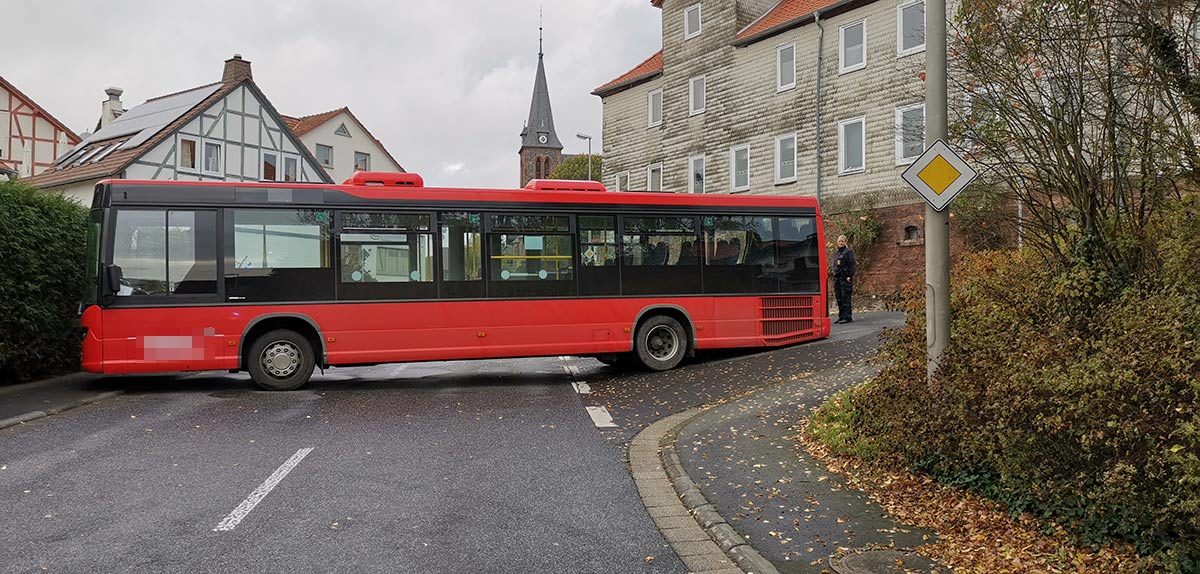 SCHWALMSTADT-ALLENDORF/LANDSBURG. Für eine, wenn auch vorübergehend, himmlische Ruhe sorgte am Mittwochmorgen ein 50 Jahre alter Busfahrer aus Ungarn in Schwalmstadt-Allendorf. Zum Erkunden einer für ihn neuen Route folgte der Pechvogel von der Schule in Allendorf kommend seinem Navigationssystem und bog fälschlicherweise in den engen Lindenweg ab.