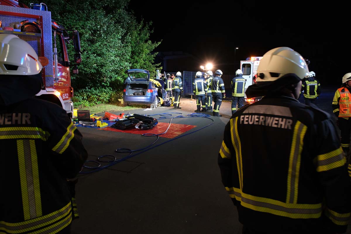 Während der 19-Jährige ohne Hilfe von hydraulischer Schere und Spreizer das Unfallwrack verlassen konnte, entschied sich der Rettungsdienst beim Beifahrer für eine schonende Rettung und alarmierte die Feuerwehr der Kernstadt nach. Da bei dem 21-Jährigen eine Verletzung des Rückens nicht ausgeschlossen werden konnte, entschloss sich Einsatzleiter Andreas Paul in enger Zusammenarbeit mit dem Rettungsdienst für eine schonende Rettung des jungen Mannes.